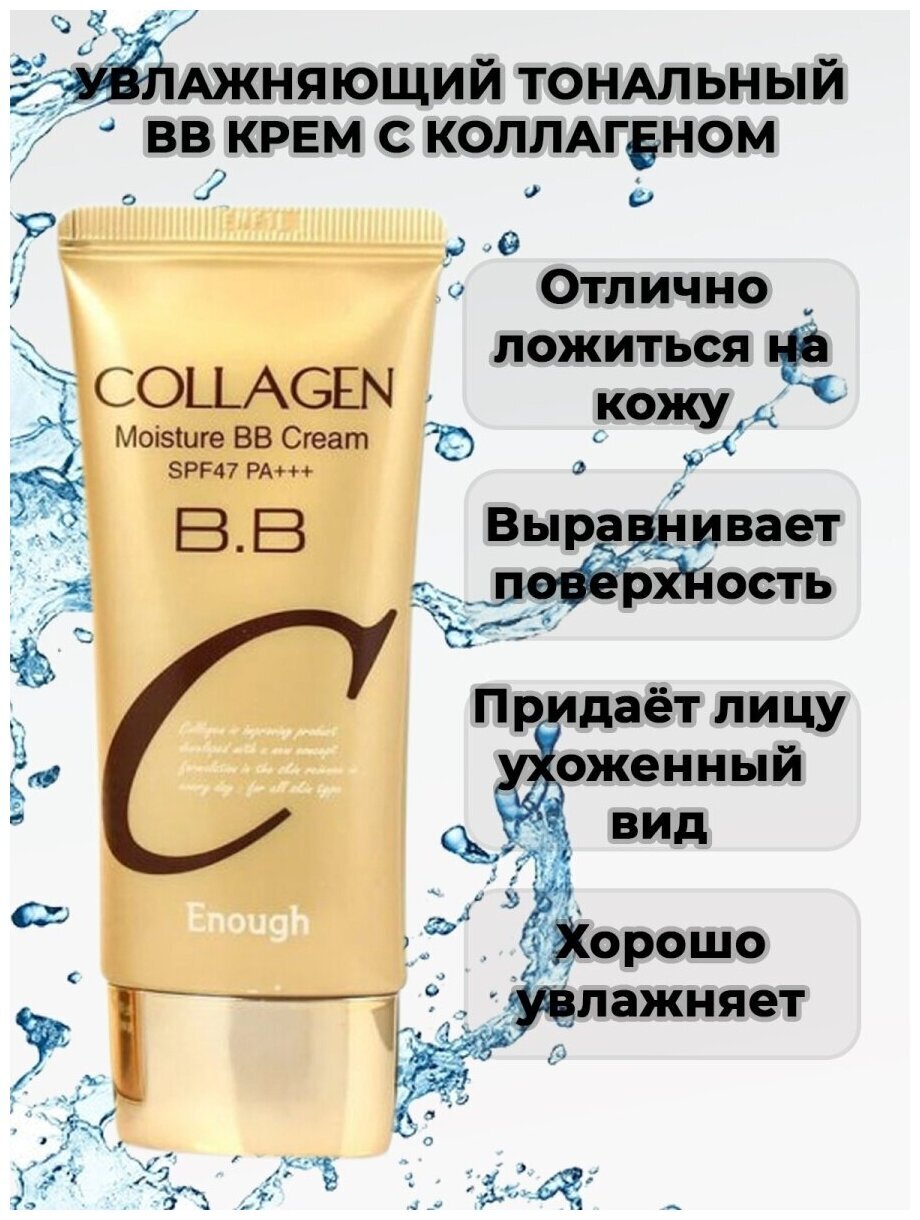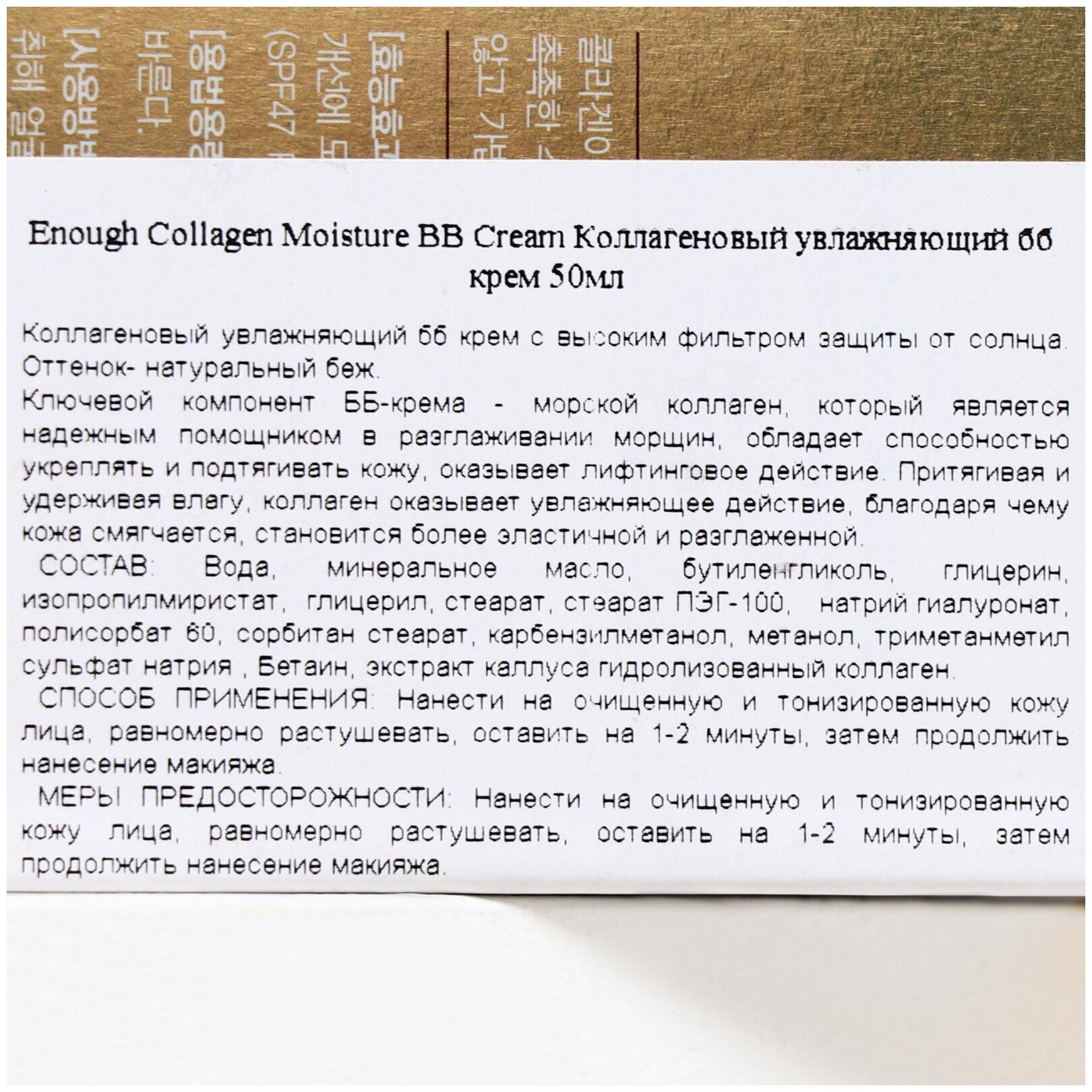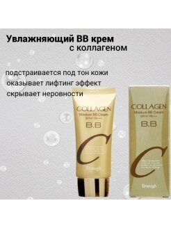 BB крем от Enough, имеющий высокую степень защиты от УФ-лучей, оберегает кожу от фото-старения. Крем обладает хорошей кроющей способностью, отлично ложится на кожу и подстраивается под ее тон. Заполняя морщинки, крем выравнивает поверхность кожи, придает лицу свежий, ухоженный вид. Благодаря гиалуроновой кислоте и морскому коллагену, кожа становится увлажненной, упругой, эластичной.