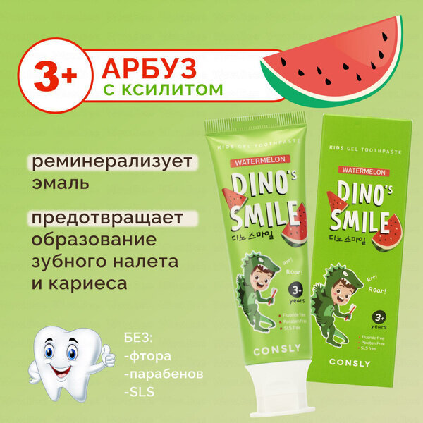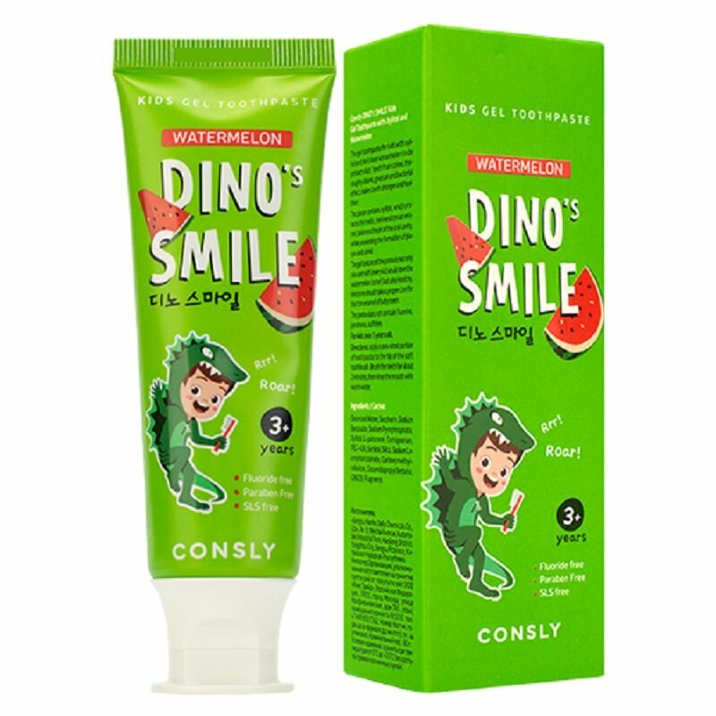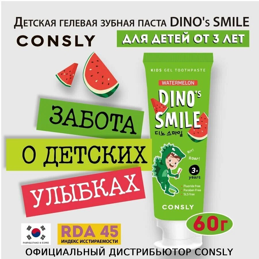 Гелевая зубная паста Consly Dino's Smile Kids Gel Toothpaste Watermelon предназначена для детей от 3 лет и старше.
