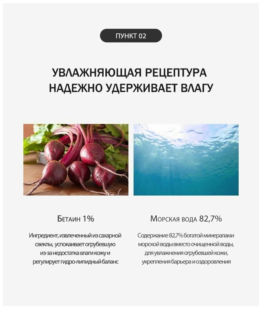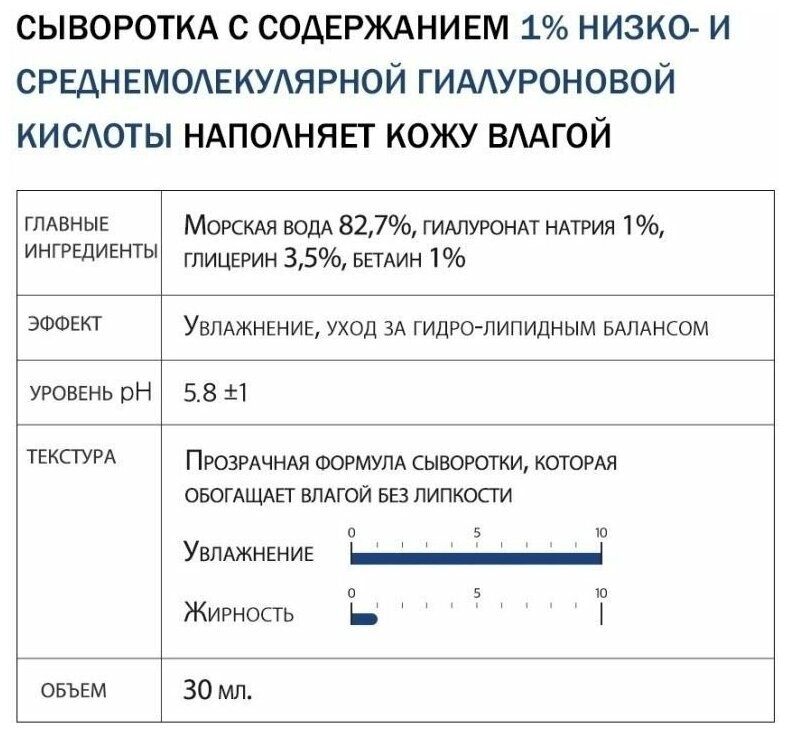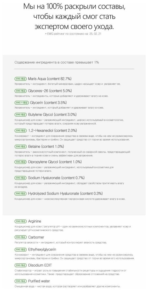 Sea Water, Glycereth-26, Glycerin, Butylene Glycol, 1.2-Hexanediol, Betaine, Dipropylene Glycol, Sodium Hyaluronate, Arginine, Carbomer, Hydrolyzed Sodium Hyaluronate, Ethylhexylglycerin, Disodium EDTA, Purified water.