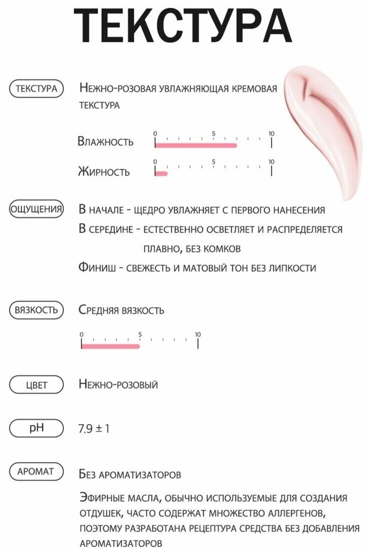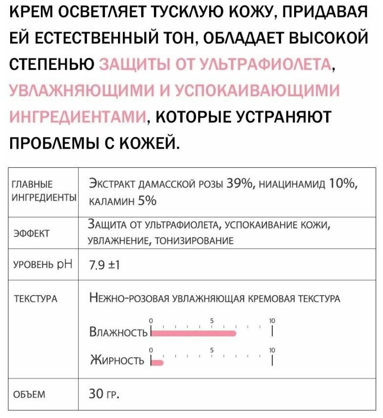 Особенностью этого крема является его необычный розовый цвет. После нанесения он подстраивается под естественный тон кожи, не меняя его, а лишь добавляя тусклому эпидермису яркости и обеспечивая приятное сияние.
