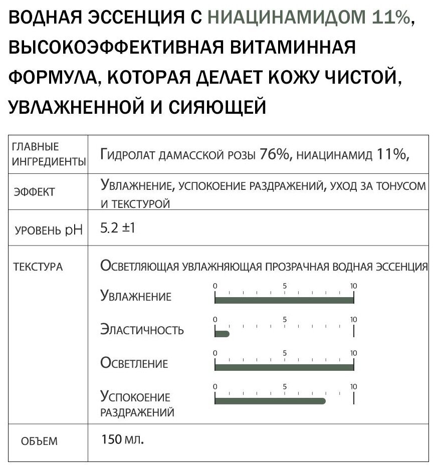 Корейская эссенция для лица с 11% содержанием ниацинамида, которая отлично подходит для чувствительной кожи. Ведущий ингредиент в составе активно восстанавливает барьерную функцию кожи, борется с тусклостью, осветляет, повышает эластичность и оказывает успокаивающее действие. Ниацинамид также действует как мощный антиоксидант, обеззараживает кожу и борется с бактериями. Способ применения: после этапа очищения распределите эссенцию на ладонях. Далее, похлопывающими легкими движениями распределите средство по лицу до полного впитывания. При обезвоженном состоянии кожи повторите процедуру.