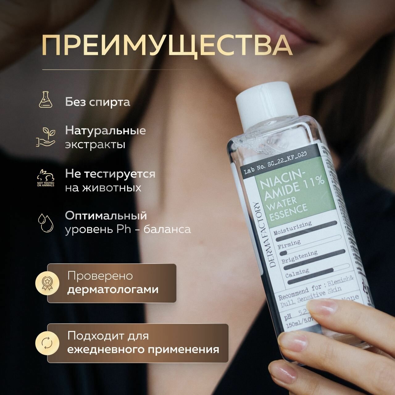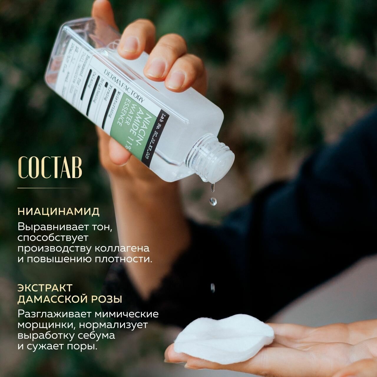 - Ниацинамид (Витамин B3) - замедляет доставку меланина к эпидермису, предотвращает образование пигментных пятен, снижает чувствительность к внешним раздражителям, выравнивает тон, способствует производству коллагена и повышению плотности.