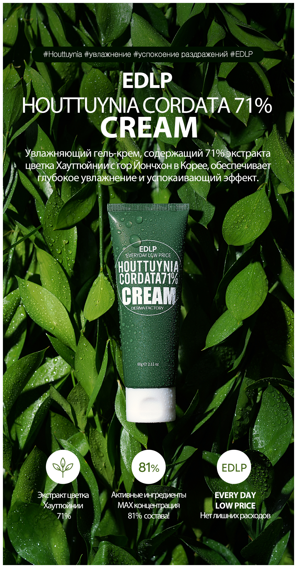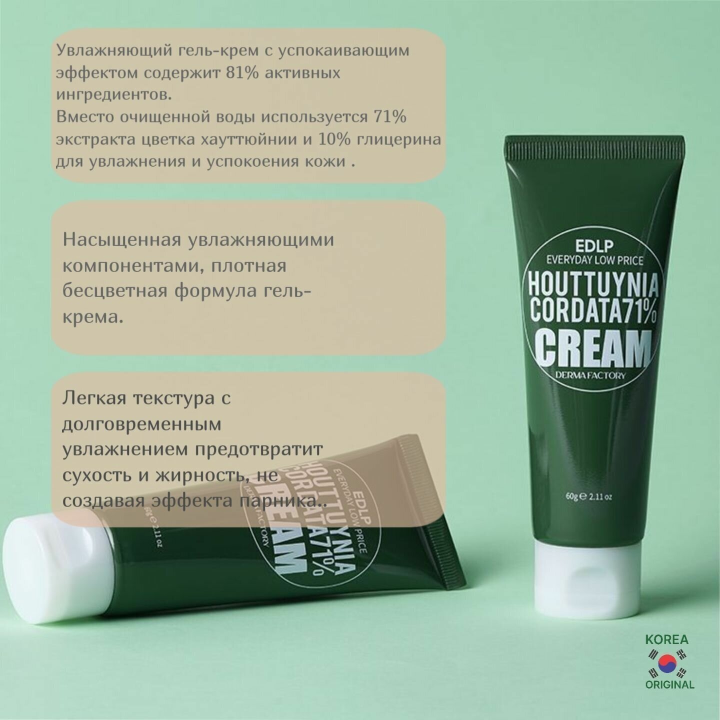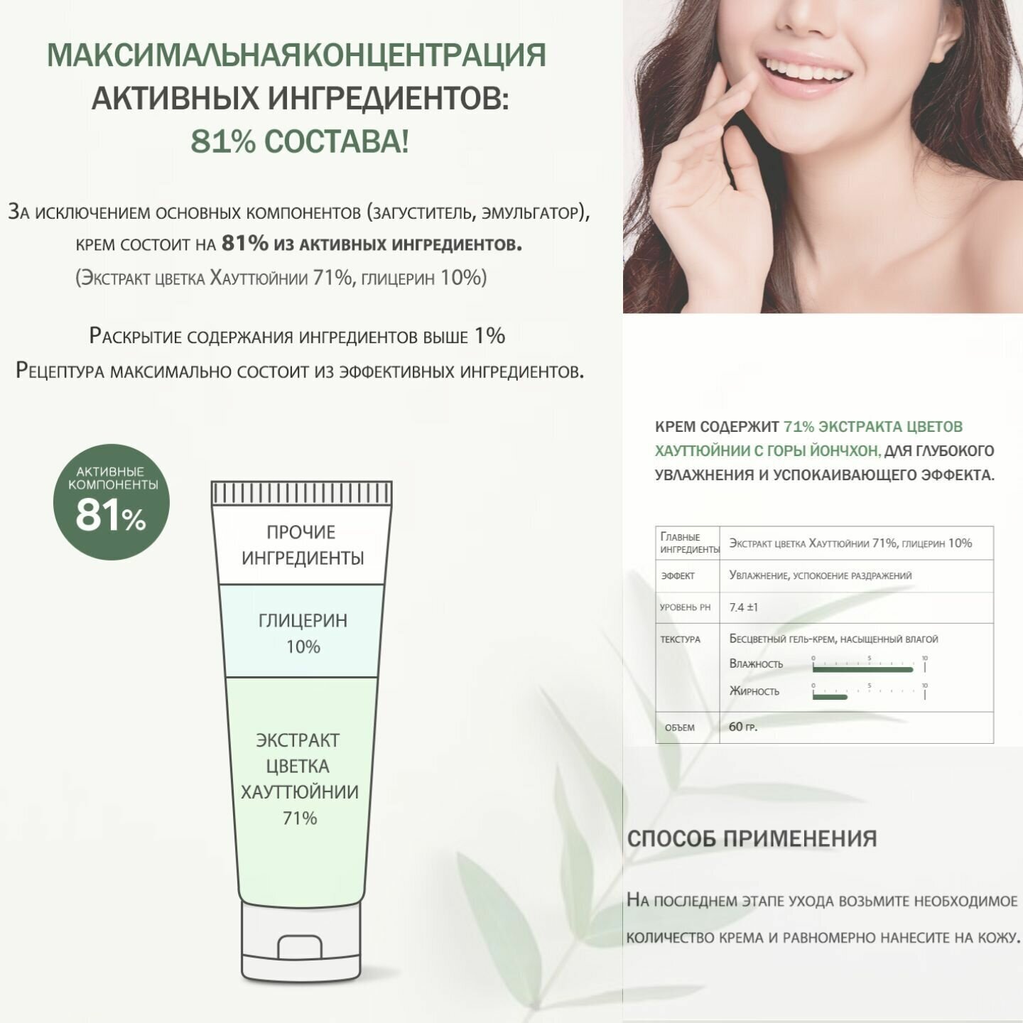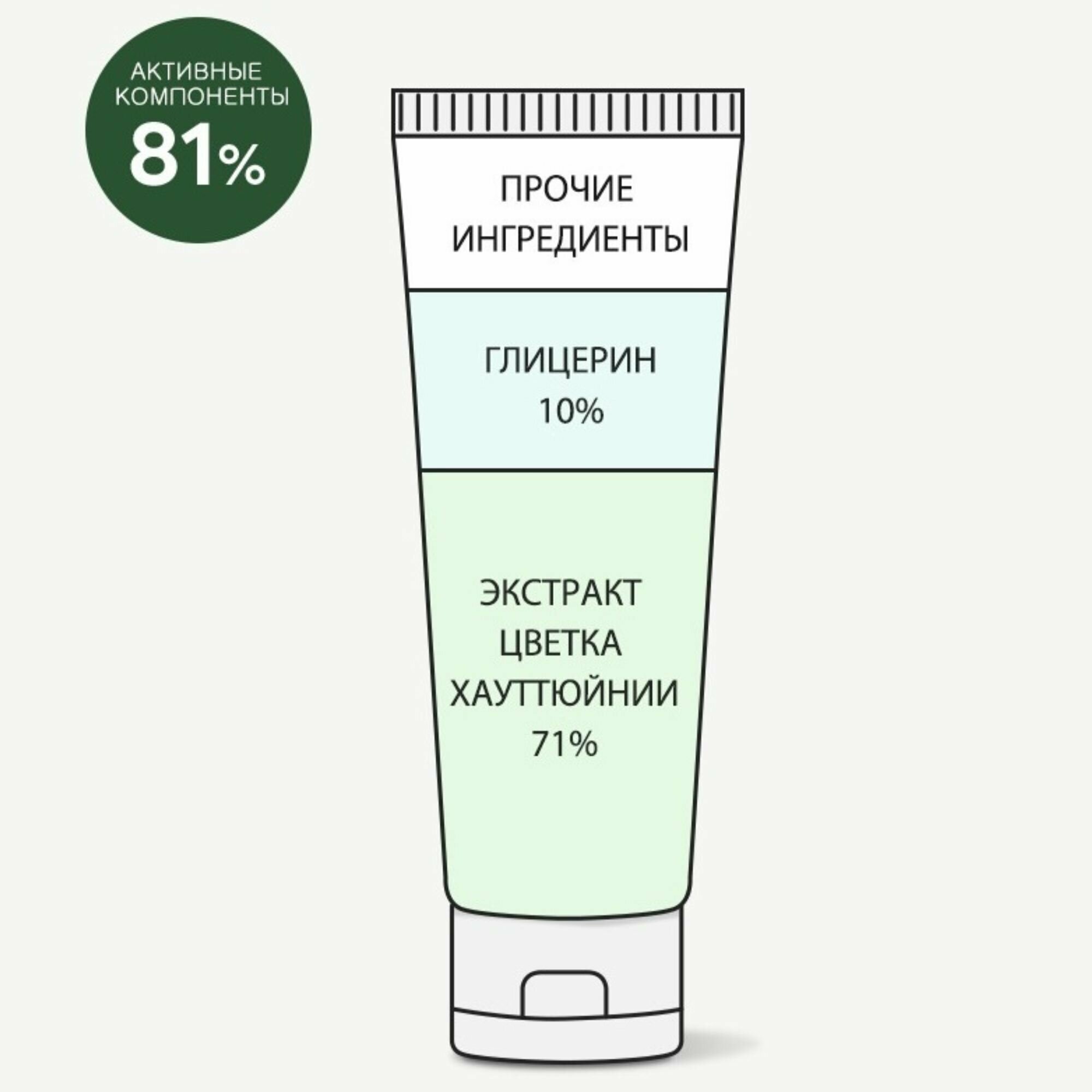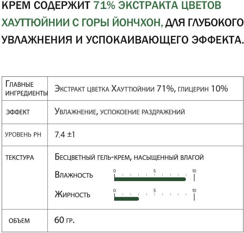 Увлажняющий гель-крем с успокаивающим эффектом содержит 81% активных ингредиентов, т. е. вместо очищенной воды используется 71% экстракта цветка хауттюйнии и 10% глицерина для увлажнения и успокоения кожи. Легкая текстура с долговременным увлажнением предотвратит сухость и жирность, не создавая парникового эффекта. Способ применения: На последнем этапе ухода возьмите необходимое количество крема и равномерно нанесите на кожу. Цель применения Увлажнение Тонизирование Восстановление Основные ингредиенты и их полезные свойства Экстракт хауттюйнии - сердцевидной обладает яркими заживляющими и противовоспалительными свойствами. Нормализует состояние кожи, снимает раздражения, уменьшает очаги воспаления. Укрепляет иммунитет кожи, делает ее менее чувствительной и реактивной. Масло семян камелии - составляет основу средства. Глубоко восстанавливает кожу, улучшает барьерные функции, укрепляет защитный слой, препятствующий испарению влаги и оберегающий кожу от агрессивного внешнего воздействия. Заживляет поврежденные волокна эпидермиса, стимулирует синтез коллагена и эластина, помогает поддерживать плотность и эластичность кожи. Пантенол (витамин В5) - ускоряет заживление, снимает раздражение и зуд, восстанавливает. Глицерин - увлажнитель (притягивает влагу к коже), естественно смягчающий, и оказывает охлаждающее действие на кожу.