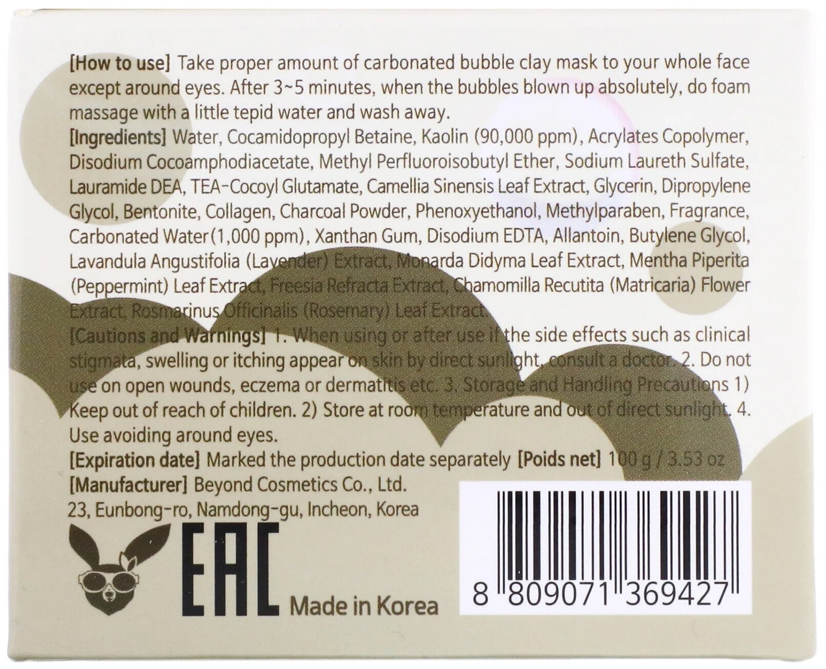 Water, Cocamidopropyl Betaine, Kaolin, Acrylates Copolymer , Disodium cocoamphodiacetate, Methyl Perfluoroisobutyl Ether , Sodium laureth sulfate, Lauramide DEA, TEA-Cocoyl Glutamate , Camellia Sinensis Leaf Powder , Glycerin, Dipropylene glycol , Bentonite, Collagen, Charcoal Powder , Phenoxyethanol, Methylparaben, Fragrance, Carbonated Water, Xanthan Gum, Disodium EDTA, Allantoin, Butylene Glycol, Lavandula Angustifolia (Lavender) Extract, Monarda didyma leaf extract, Mentha Piperita (Peppermint) Leaf Extract, Freesia refracta extract, Chamomilla Recutita (Matricaria) Flower Extract, Rosmarinus Officinalis (Rosemary) Leaf Extract