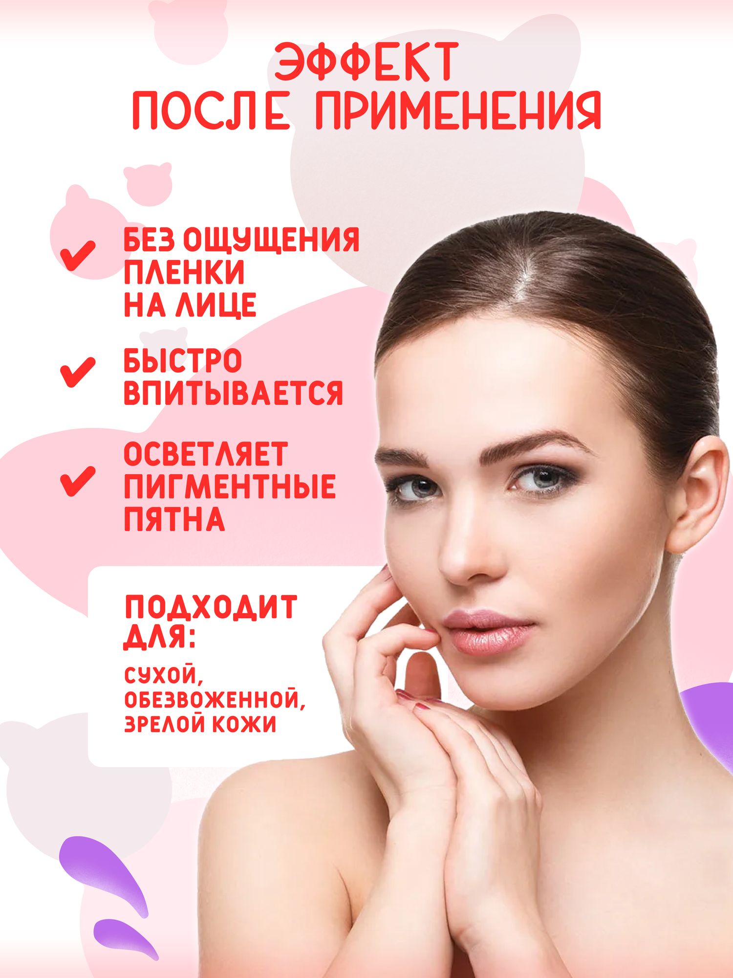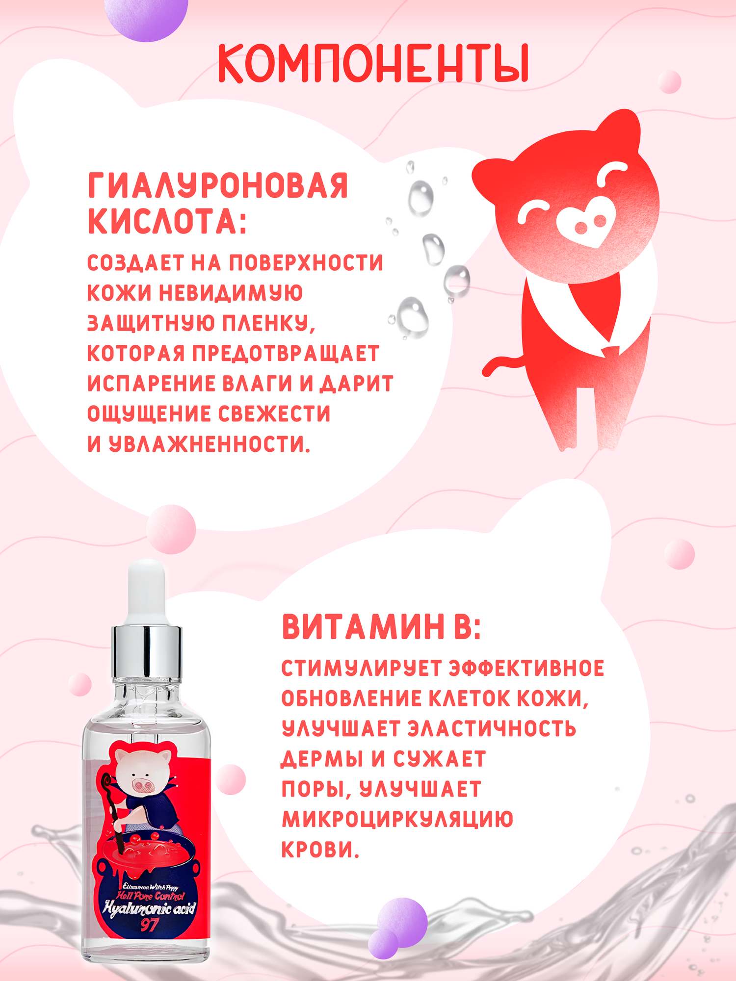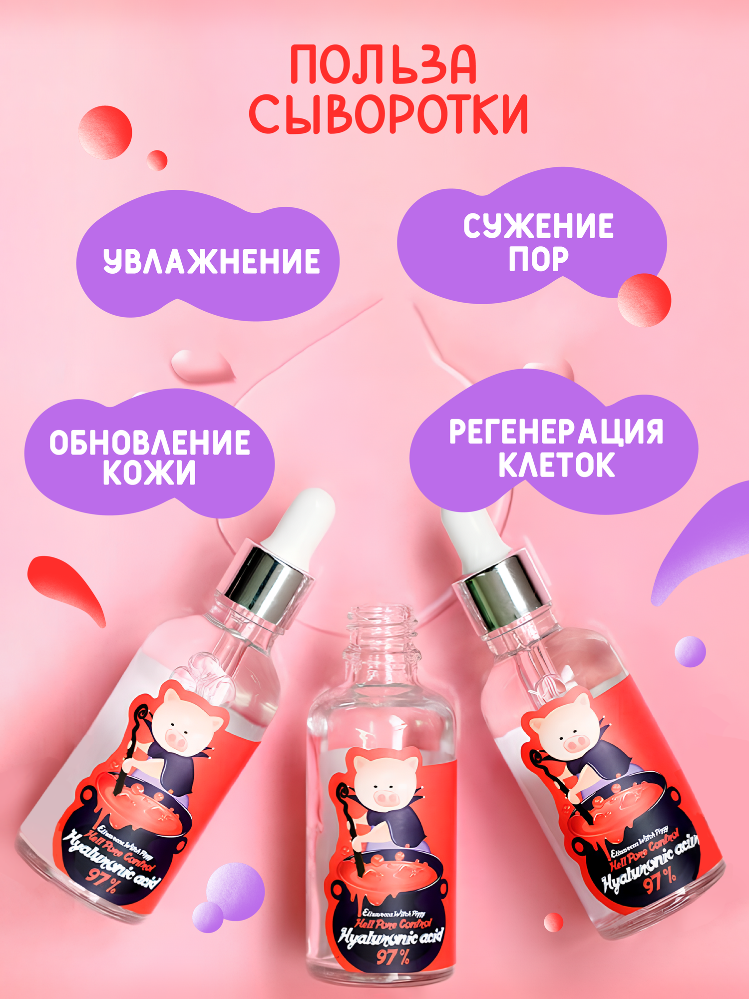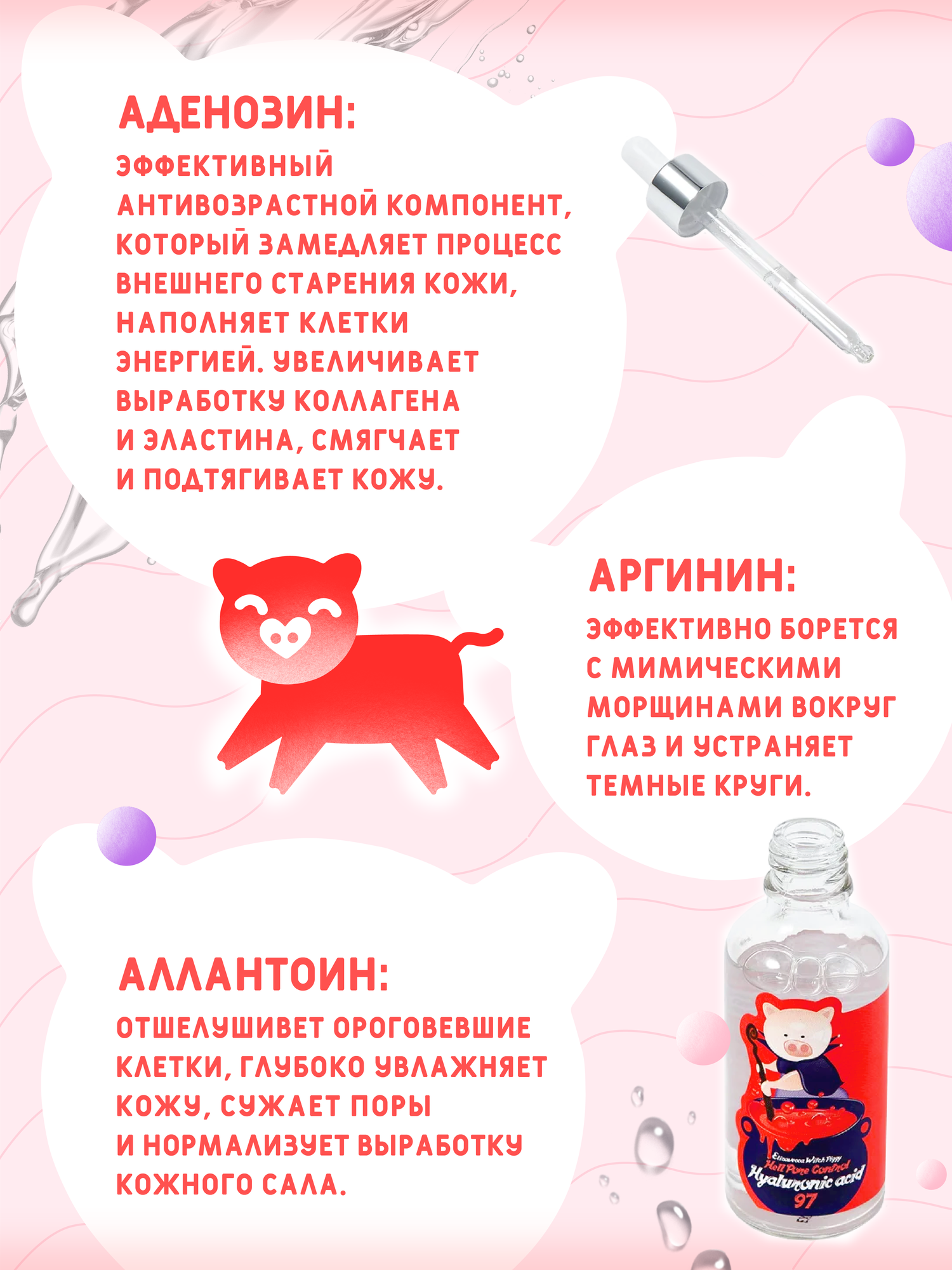 Сыворотка для лица на 97% состоит из гиалуроновой кислоты. Сыворотка разглаживает мимические морщины, повышает упругость, обеспечивает эффективное глубокое увлажнение. Запечатывает влагу внутри клеток. Не оставляет неприятное ощущение липкости. Выравнивает тон лица, осветлят проблемные участки. Может использоваться как самостоятельно, так и "под крем". Подходит для ежедневного применения. Сыворотка для лица на 97% состоит из гиалуроновой кислоты. Сыворотка разглаживает мимические морщины, повышает упругость, обеспечивает эффективное глубокое увлажнение. Запечатывает влагу внутри клеток. Не оставляет неприятное ощущение липкости. Выравнивает тон лица, осветлят проблемные участки. Может использоваться как самостоятельно, так и "под крем". Подходит для ежедневного применения. Цель применения: Интенсивное увлажнение. Омоложение кожи. Устранение болезнетворных проявлений. Основные ингредиенты и их полезные свойства: 1. Гиалуроновая кислота — базовый компонент сыворотки (97%!). Отвечает за глубокое увлажнение кожи и поддержание на оптимальном уровне естественного ph-баланса кожи. Гиалуроновая кислота образует на кожу неосязаемый защитный слой, который препятствует испарению влаги и дарит комфортное ощущение свежести и увлажненности на лице. 2. Ниацинамид способствует стимуляции синтеза коллагена и улучшению защитных функций кожи, помогает снизить трансэпидермальную потерю влаги из кожи и снизить пигментацию, смягчает, повышает эластичность кожи, увлажняет, сужает поры, успокаивает, эффективен при использовании для чувствительной кожи, оказывает согревающее действие и улучшает микроциркуляцию крови, осветляет. 3. Аденозин — компонент отвечающий за антивозрастной уход за кожей — замедляет процесс увядания кожи. 4. Аллантоин смягчает, интенсивно увлажняет кожу, способствует сужению пор и нормализации выработки кожного сала, обладает противовоспалительными свойствами, успокаивает раздраженную кожу. 5. Аргинин — это аминокислота, которая обладает ранозаживляющим и лечебным действием, устраняет несовершенства кожи, укрепляет тургор и повышает тонус эпидермиса. Рекомендуется применять курсом, утром и вечером. Форма выпуска: 50 мл. Комплектация: Сыворотка для лица, 50 мл, 1 штука. Тип кожи: Для всех типов кожи. Срок годности в днях: См. на упаковке. Состав: Sodium Hyaluronate, Niacinamide, Propylene Glycol , 1,2-Hexanediol, PEG-60 Hydrogenated Castor Oil, Adenosine , Allantoin , Carbomer , Arginine , Fragrance. Способ применения: На очищенную кожу нанести 2-3 капли и равномерно распределить. Рекомендуется применять курсом, утром и вечером. Страна-изготовитель: Южная Корея. Бьюти-ингредиент: Гиалуроновая кислота. Возрастной диапазон: от 25 лет. Эффект от использования уходовой косметики: Антивозрастной уход; УвлажнениеПрименение: Дневной уход. Особенности состава: Подходит для ежедневного применения. Солнцезащитная косметика: Нет.