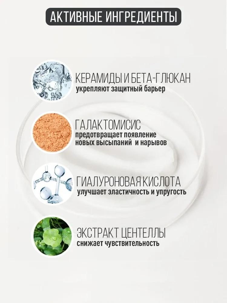 Экстаркт центеллы азиатской обладает противовоспалительным и ранозаживляющим действием, способствует восстановлению барьерных свойств кожи и удержанию влаги, снижает чувствительность кожи, уменьшает отеки, оказывает сосудоукрепляющее действие и уменьшает купероз.