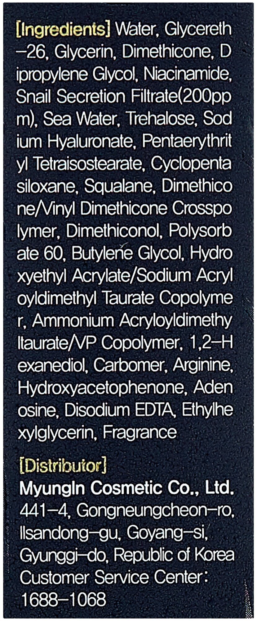 water, glycereth-26, glycerin, dimelhicone, dipropylene glycol, niacinamide, snail secretion filtrate(200ppm), sea water, trehalose, sodium hyaluronate, pentaerythrityl tetraisostearate, cyclopentasiloxane, squalane, dimethicone/vinyl dimethicone crosspolymer, dimethiconol, polysorbale 60, butylene glycol, hydroxyethyl acrylate/sodium acryloyldimethyl taurate copolymer, ammonium acryloyldimethyitaurate/vp copolymer, 1,2-hexanediol, carbomer, arginine, hydroxyacetophenone, adenosine, disodium edta, ethylhexylglycerin, fragrance