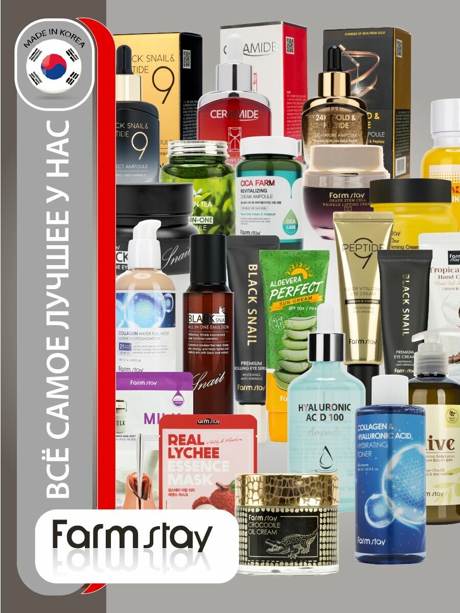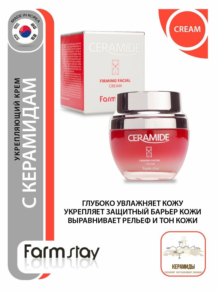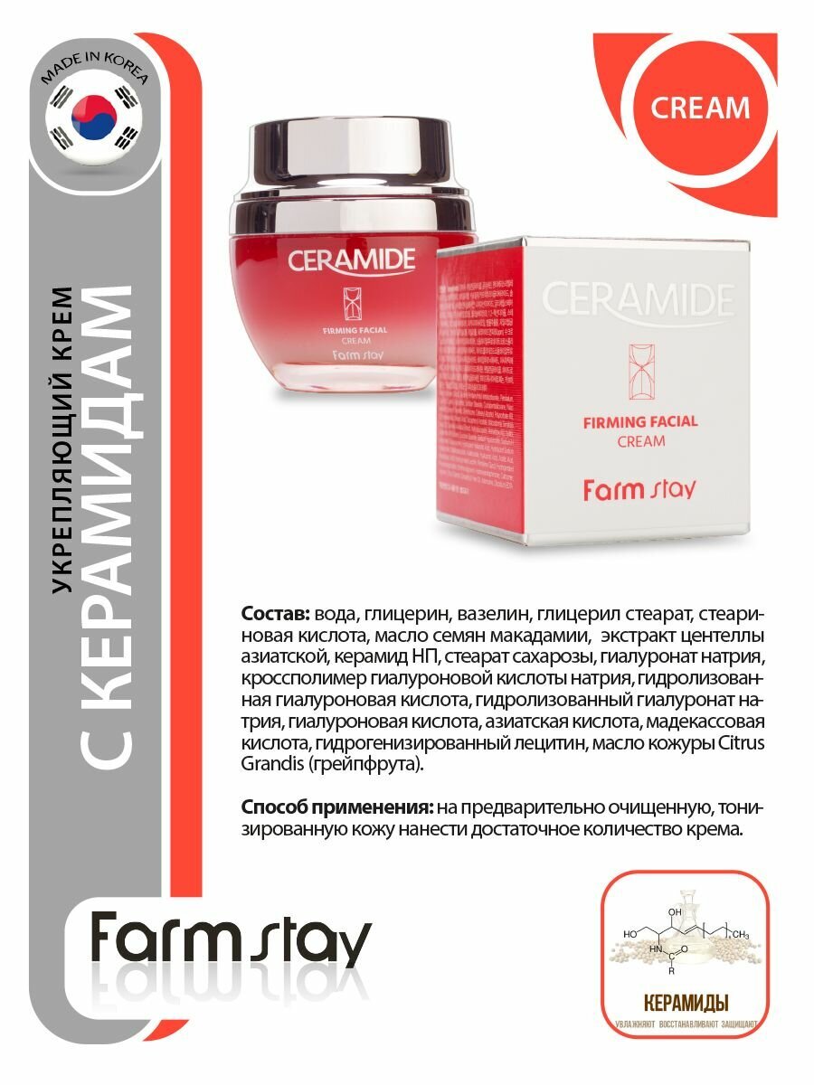 Крем для ухода за кожей лица, шеи и зоны декольте Корея глубоко увлажняет кожу, укрепляет ее, выравнивает рельеф и тон, создаёт защитный увлажняющий слой, наполняет кожу влагой и укрепляет её. Устраняет последствия стрессов и недосыпов, борется с преждевременным старением, не позволяя появляться новым морщинкам. Керамиды укрепляют защитный барьер кожи и глубоко увлажняют. Экстракт центеллы азиатской и мадекассосид снимет раздражение и устранит шелушение кожи. Масло косточки грейпфрута выравнивает тон кожи. Коктейль этих компонентов обеспечит подтягивающий эффект. Лёгкая текстура и нежный, ненавязчивый аромат. Подойдет для всех типов кожи, в том числе и для проблемной. Применение: на предварительно очищенную, тонизированную кожу нанести достаточное количество крема. Идеальный подарок женщине, маме, подруге, девушке, любимой на день рождения, Новый год, 8 марта, день Святого Валентина. Рекомендуется к использованию в комплексе с серией корейской косметики для ухода за лицом и телом FarmStay / Фарм Стей.