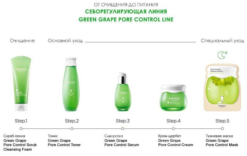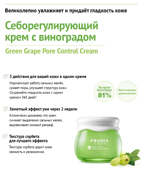Себорегулирующий крем с виноградом Frudia Green Grape Pore Control Cream Mini - это профессиональное средство для ухода за кожей лица, шеи и декольте. Продукт рекомендован для склонной к жирности и проблемам кожи, включая акне, чувствительность и проблемную кожу.