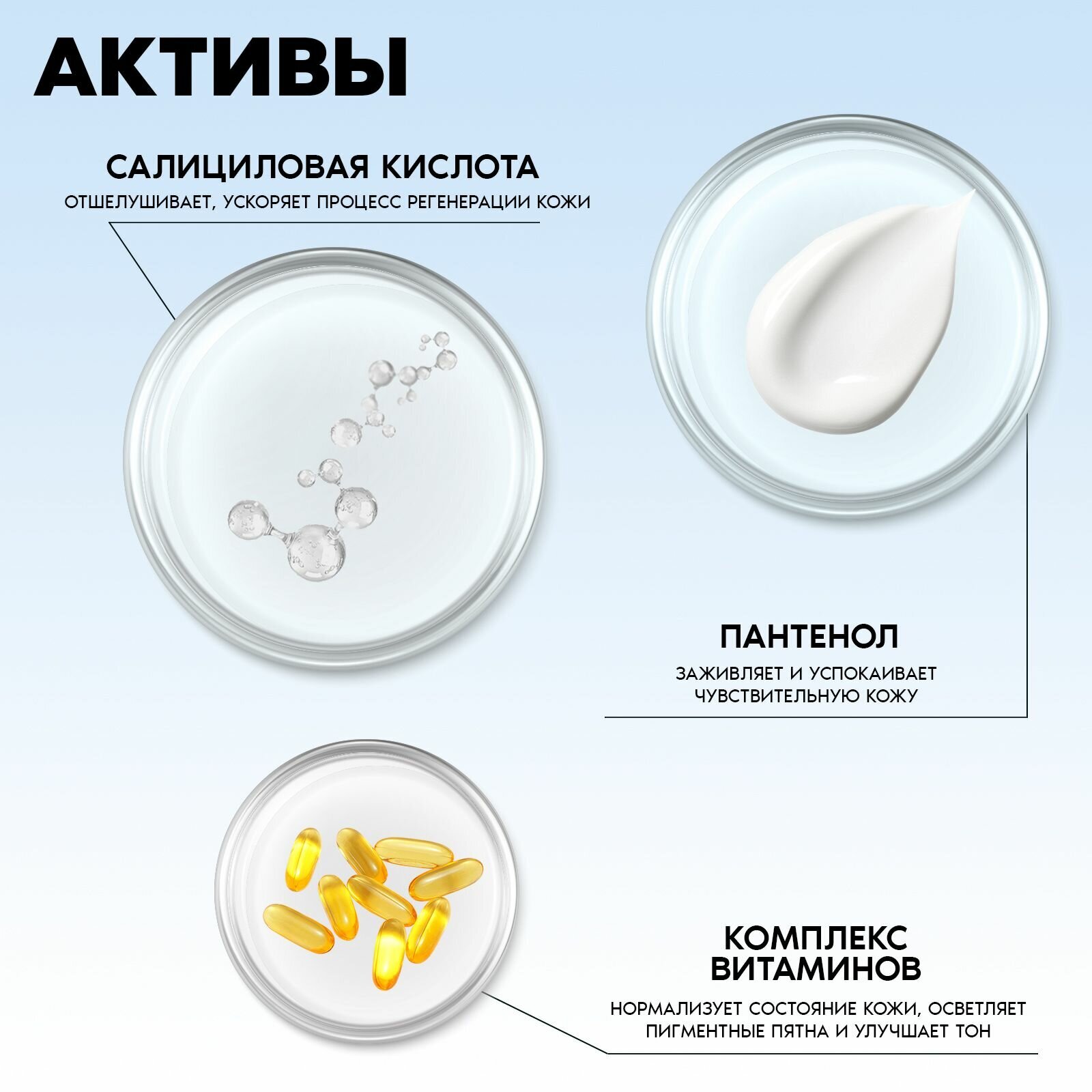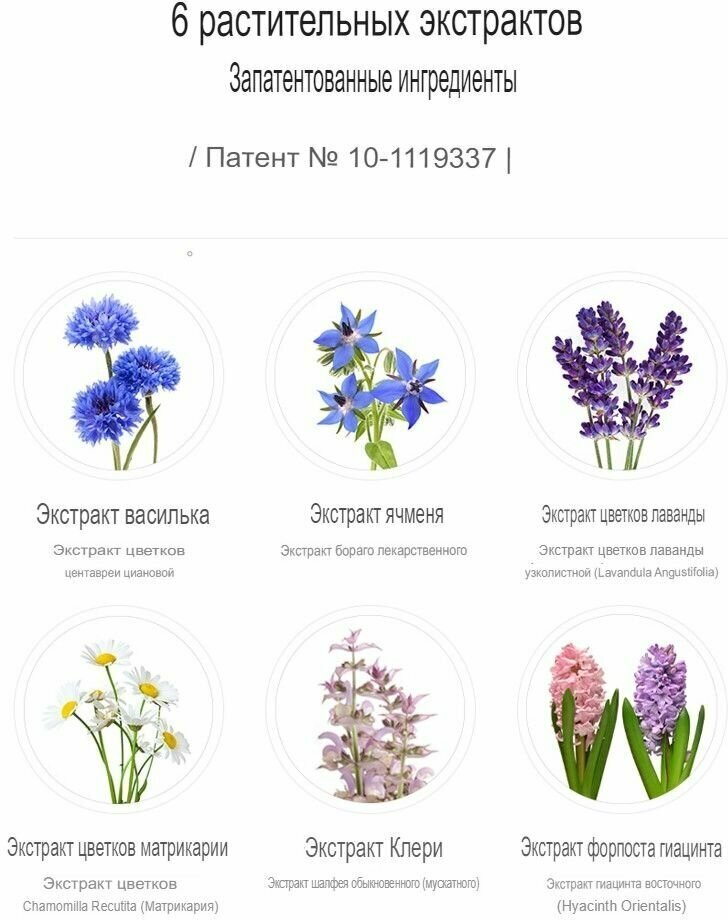 Запатентованный растительный комплекс шести экстрактов, включающий цветы василька, бораго, цветы лаванды, цветы матрикарии, шалфей и гиацинт, успокаивает кожу и снимает раздражение, способствует регенерации клеток и повышает ее иммунитет.