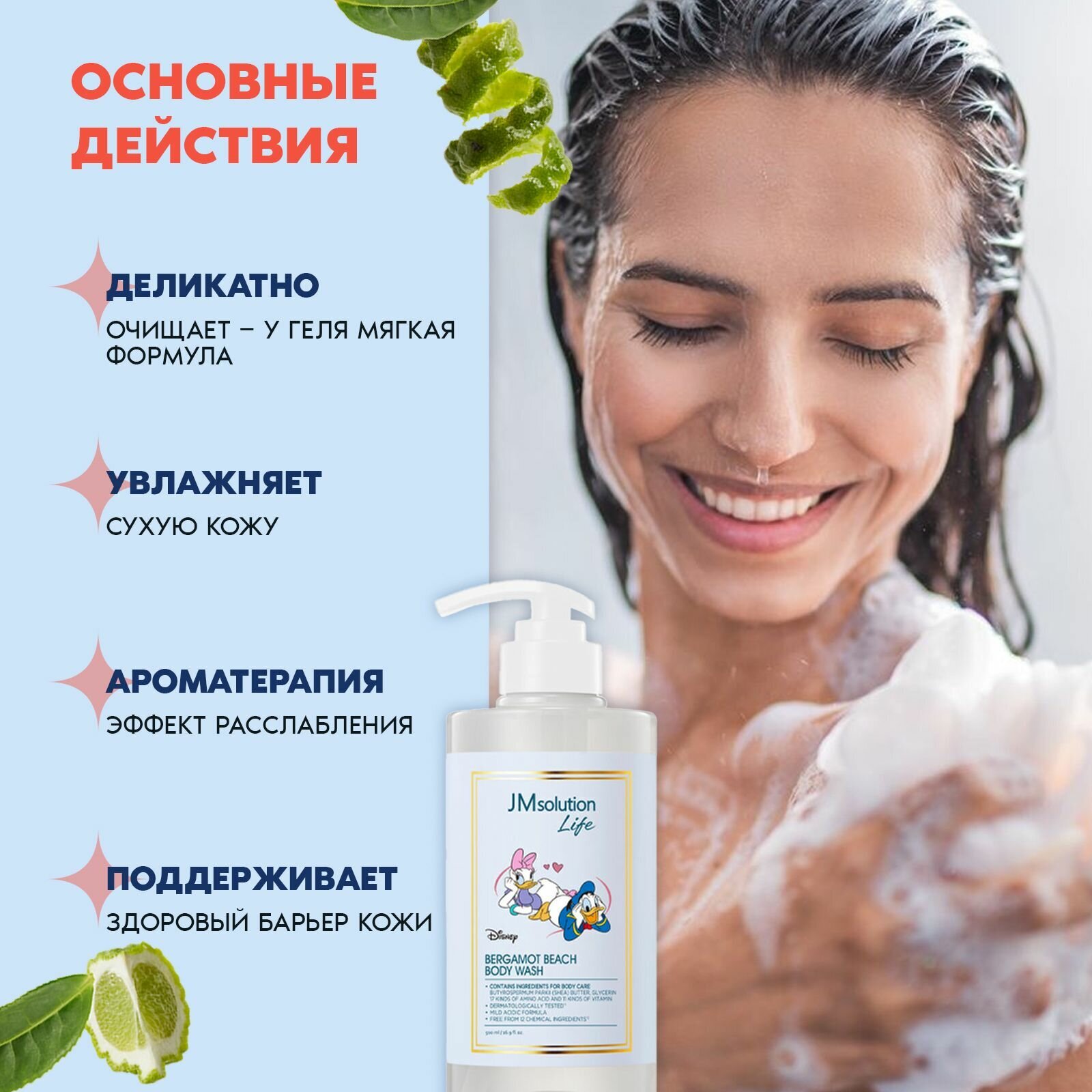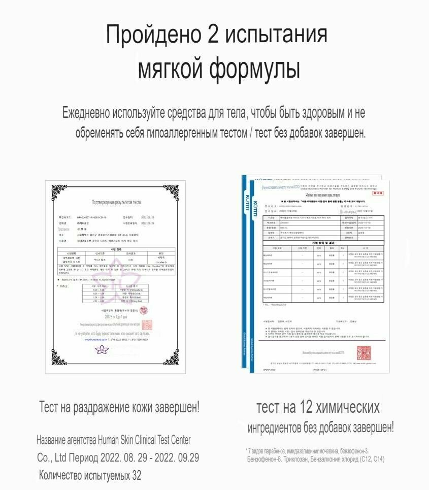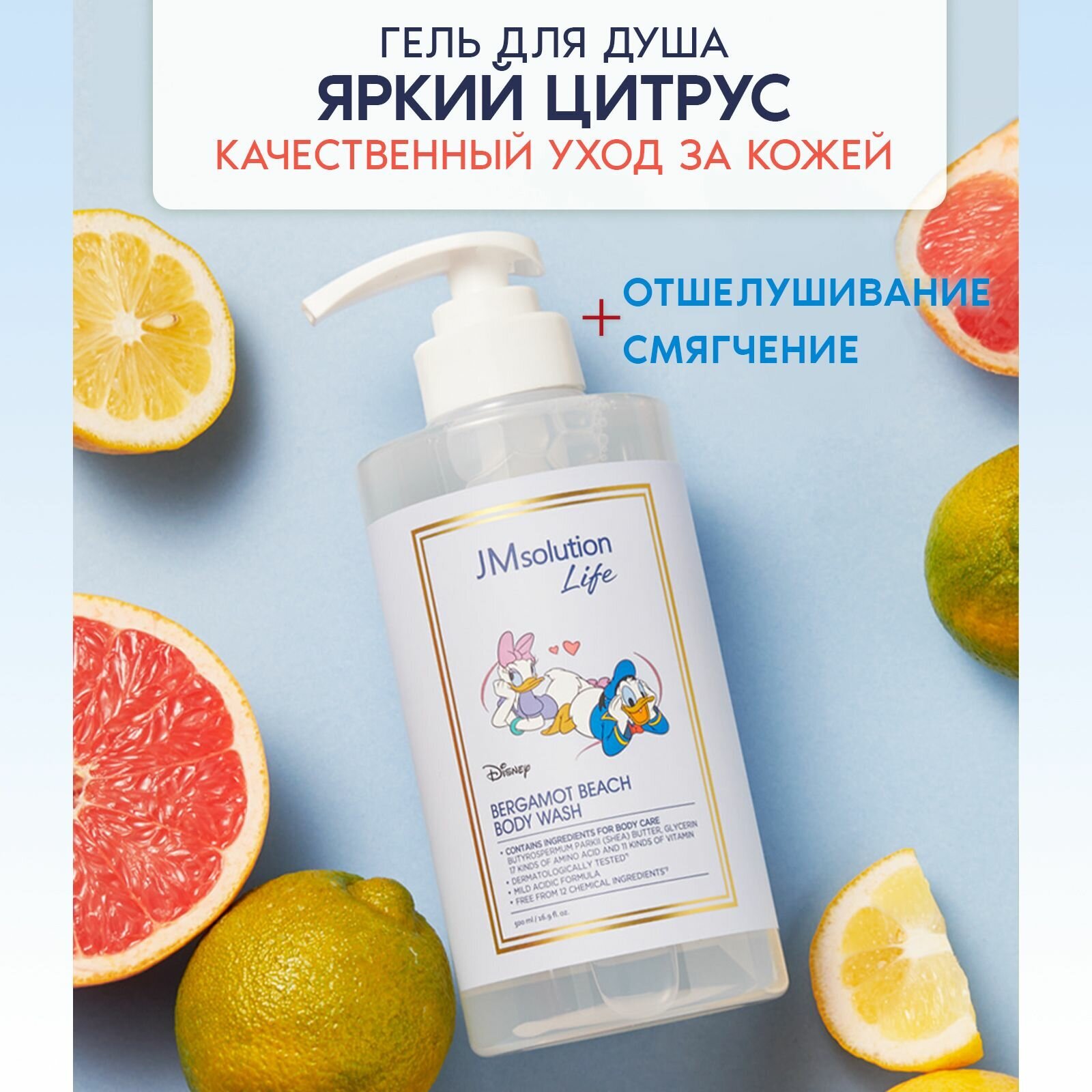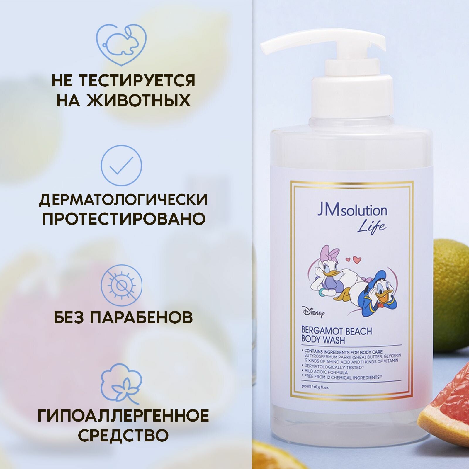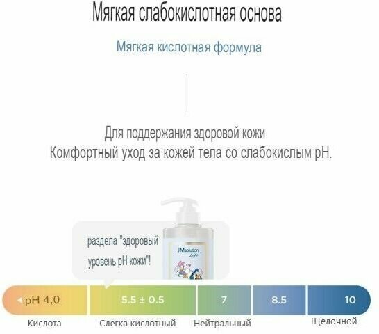 Гель для душа JM Solution "New Disney" прошел гипоаллергенные испытания, которые подтвердили, что он не вреден для здоровья, не вызывает аллергии и не содержит химических добавок.