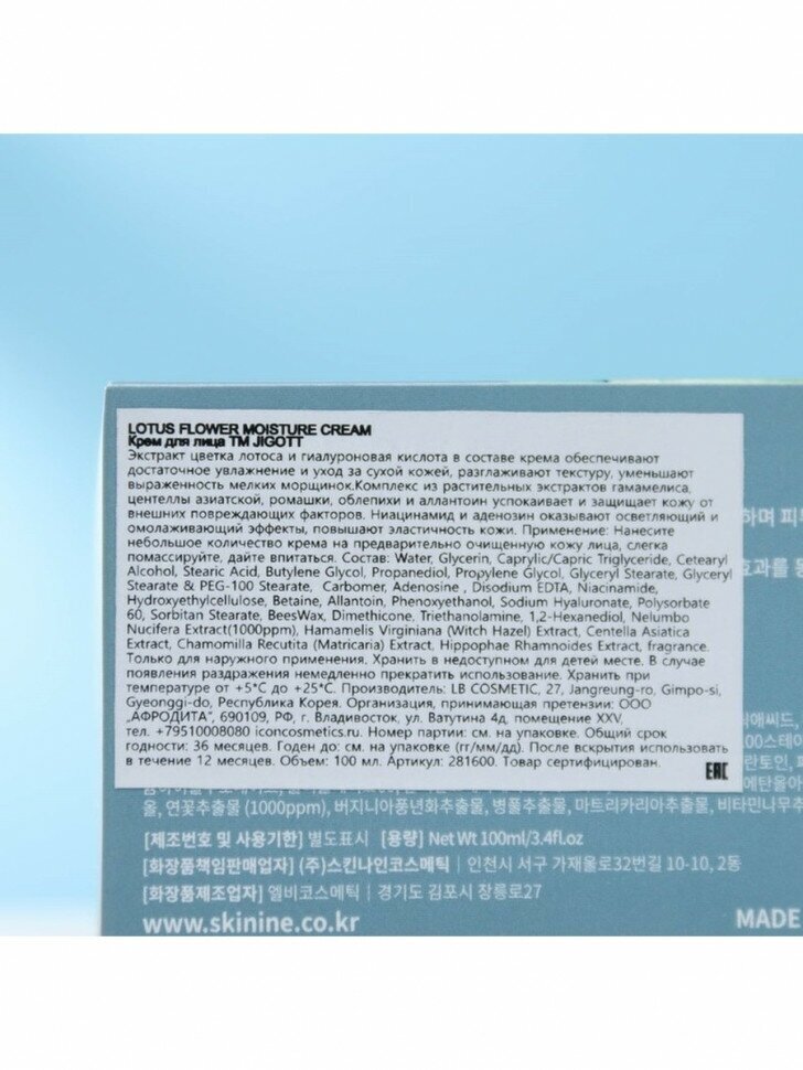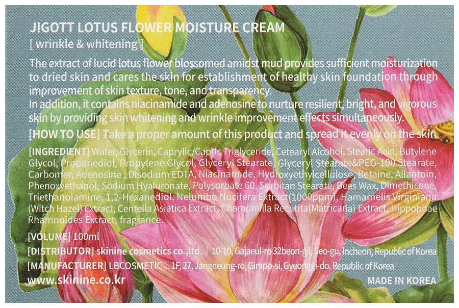 Серия по уходу Jigott Flower создана с использованием особых циклических пептидов цветочного происхождения, восстанавливающих кожную поверхность. Вытяжка лотоса обладает антиоксидантными свойствами, ограждает дерму от негативного воздействия свободных радикалов. Она имеет выраженные омолаживающие качества, тонизирует и освежает кожу, замедляет процессы старения и увядания. Этот компонент эффективно борется с возрастными изменениями, убирает имеющиеся морщины, препятствует появлению новых. Экстракт лотоса также имеет осветляющее действие, выравнивает оттенок кожного покрова, улучшает цвет лица. Благодаря противовоспалительным свойствам этого компонента, содержащий его крем убирает различные раздражения, покраснения, быстро залечивает небольшие ранки и микротрещинки. Крем с лотосом успокаивает кожный покров, способствует его быстрому восстановлению и обновлению. Крем прост и приятен в использовании, наносится на сухую кожу мягкими массажными движениями. Циклопептиды индийского лотоса обладают биостимулирующим действием, укрепляют тургор и придают коже ровный тон. Нелюмбин замедляет клеточное окисление. Ниацинамид и аденозин повышают упругость и замедляют старение. Особая форма витаминов С и Е, содержащихся в плодах облепихи, наполняет кожу энергией, устраняет неровности кожного рисунка и микрорельефа. Крем с экстрактом лотоса, обеспечивает достаточную степень гидратации кожи, улучшает текстуру, тонизирует. Кроме того, крем содержит ниацинамид и аденозин, которые обеспечивает защиту от вредного воздействия окружающей среды, интенсивно увлажняют, отбеливают и борются с возрастными изменениями. Способ применения Нанесите небольшое количество крема на предварительно очищенную кожу лица, слегка помассируйте, дайте впитаться. Состав Water, Glycerin, Caprylic/Capric Triglyceride, Cetearyl Alcohol, Stearic Acid, Butylene Glycol, Propanediol, Propylene Glycol, Glyceryl Stearate, Glyceryl Stearate&PEG-100 Stearate, Carbomer, Adenosine , Disodium EDTA, Niacinamide, Hydroxyethylcellulose, Betaine, Allantoin, Phenoxyethanol, Sodium Hyaluronate, Polysorbate 60, Sorbitan Stearate, Bees Wax, Dimethicone, Triethanolamine, 1,2-Hexanediol, Nelumbo Nucifera Extract(IOOOppm), Hamamelis Virginiana (Witch Hazel) Extract, Centella Asiatica Extract, Chamomilla Recutita (Matricaria) Extract, Hippophae Rhamnoides Extract, fragrance