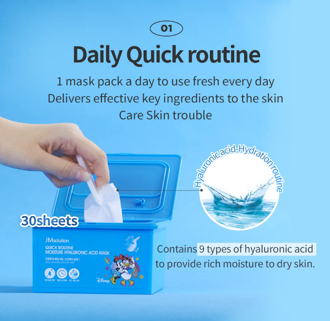 Набор тканевых масок JM Solution Quick Routine Moisture Hyaluronic Acid Mask - это быстрый и удобный базовый уход за кожей, который обеспечивает увлажнение, смягчение и разглаживание, устраняя сухость и чувство стянутости. В комплекте 30 масок, которые подходят для ежедневного использования.