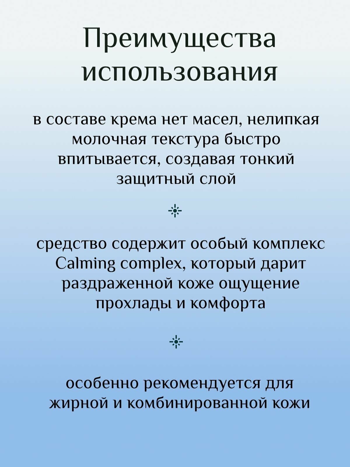 Охлаждающий безмасляный крем с высоким индексом защиты защищает от UVA- и UVB-излучения с помощью физических и химических фильтров, препятствует фотостарению и появлению морщин. Средство содержит особый комплекс Calming Complex™ (экстракт ламинарии, пшеницы, алоэ вера, березы), который дарит раздраженной коже ощущение прохлады и комфорта. Крем не содержит масел, нелипкая молочная текстура быстро впитывается, создавая тонкий защитный слой, который почти не ощущается: отличный вариант для жирной и комбинированной кожи.