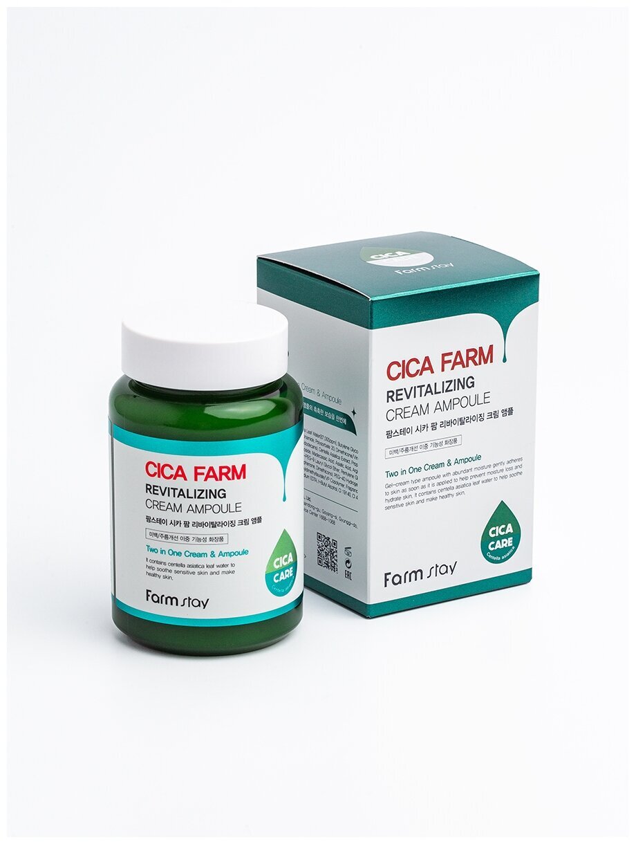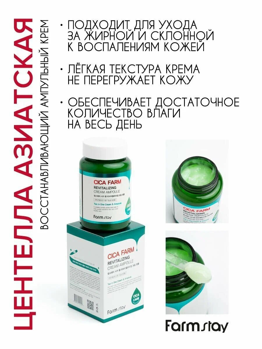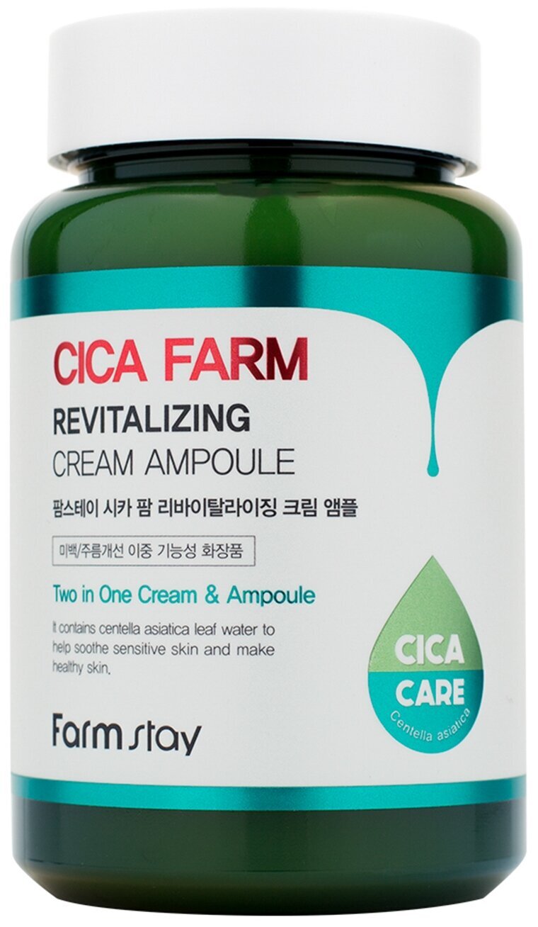 Farmstay Cica Farm Revitalizing Cream Ampoule - это ампульный восстанавливающий крем для лица с центеллой азиатской, объемом 250 мл. Этот продукт предназначен для ухода за кожей лица и подходит для всех типов кожи, включая чувствительную, раздраженную и проблемную.