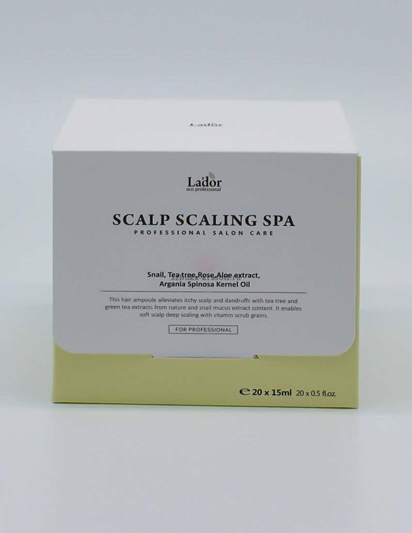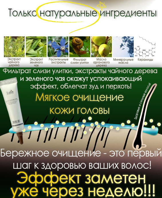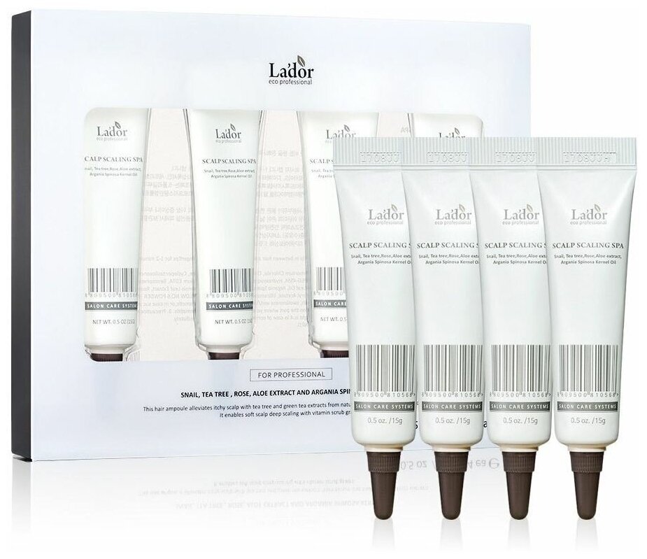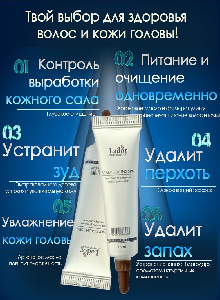 Главная задача пилинга — глубоко очистить кожу головы от ороговевших чешуек, излишков себума — кожного жира и остатков косметических средств, которые имеют свойство накапливаться на волосах и поверхности кожи. Зачем нужен пилинг для кожи головы? Отшелушивание верхнего слоя кожи — эпидермиса — очень полезно для улучшения ее состояния. Поэтому пилинг активно используют для профилактики и лечения различных проблем, связанных с кожей головы. Особенно эффективен пилинг при перхоти, которая появляется из-за себореи, при повышенной жирности и выпадении волос. При регулярном глубоком очищении ускоряется регенерация кожи головы. Отшелушивание активизирует клеточный обмен, стимулирует тонус кожи, способствует ее оздоровлению. Улучшается питание и кровоснабжение волосяных фолликулов. Кислород и различные полезные вещества легче доставляются к корням волос. Благодаря этому волосы лучше растут и становятся более сильными и здоровыми. После пилинга косметические и лечебные средства для волос действуют в разы активнее и эффективнее. Именно поэтому эта популярная процедура часто используется для подготовки кожи к воздействию более специализированного ухода в салонах и трихологических клиниках, занимающихся лечением и восстановлением волос. Регулярное глубокое очищение кожи помогает регулировать жировой обмен, нормализует работу сальных желез, дарит ощущение свежести и чистоты, устраняет зуд и другие неприятные ощущения. Салонный пилинг для кожи головы Lador Scalp Scaling Spa Ampoule — это СПА-процедура, которую можно делать в домашних условиях. Компоненты этого пиллинга тщательно очищают кожу головы и корни волос, а так же питают, охлаждают и восстанавливают кожный покров. Быстрый охлаждающий эффект ментола помогает успокоить чувствительную кожу головы, слизь улитки, аргановое масло, экстракт чайного дерева и экстракт зеленого чая питают волосяные луковицы, тщательно ухаживают за волосами, наполняют их силой. Эффект в результате использования: -здоровая кожа головы без перхоти и себорейной корки. – охлаждающий эффект, уменьшение деятельности сальных желез: волосы надолго остаются свежими у корней и увлажненными по всей длине – активизация роста волос, что помогает не только улучшить рост, но и остановить выпадение, а так же справиться с облысением. Повышается густота волос, останавливается их выпадение. Способ применения: наесите средство на кожу головы после мытья волос. Аккуратно помассируйте голову кончиками пальцев 1-2 минуты. Далее трущими движениями в течении минуты пройдитесь по всей длине волос. Тщательно смойте средство водой. Рекомендации по применению: пиллинг очень хорошо применять перед окрашиванием волос и прочими салонными процедурами: активными масками, ламинированием, применением филлеров и др. Это улучшит проникновение активных ингредиентов в волосы и кожу головы, а в случае покраски — сделает цвет более глубоким, интенсивным и стойким. Важно! Не применять сразу после окрашивания! (может сказаться на интенсивности цвета только что окрашенных волос). Рекомендуется применять 1 раз в две недели или непосредственно перед салонной процедурой.