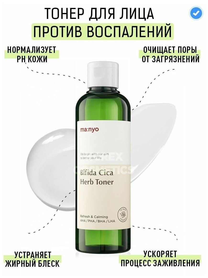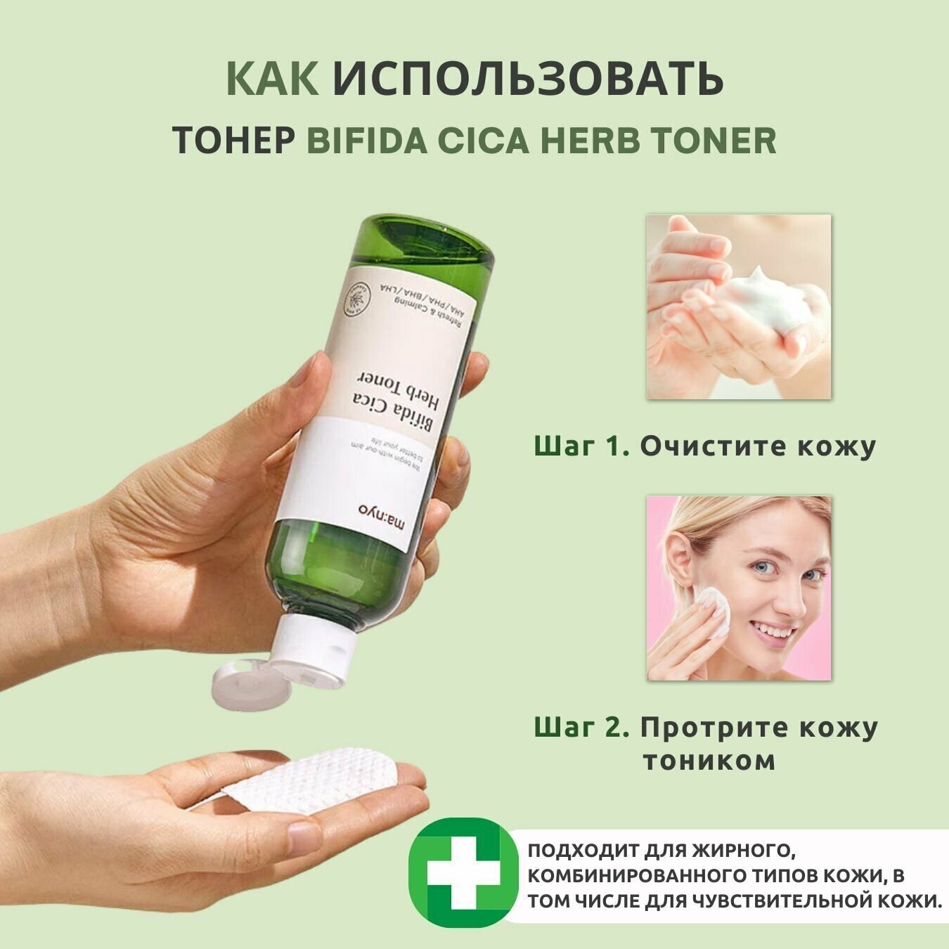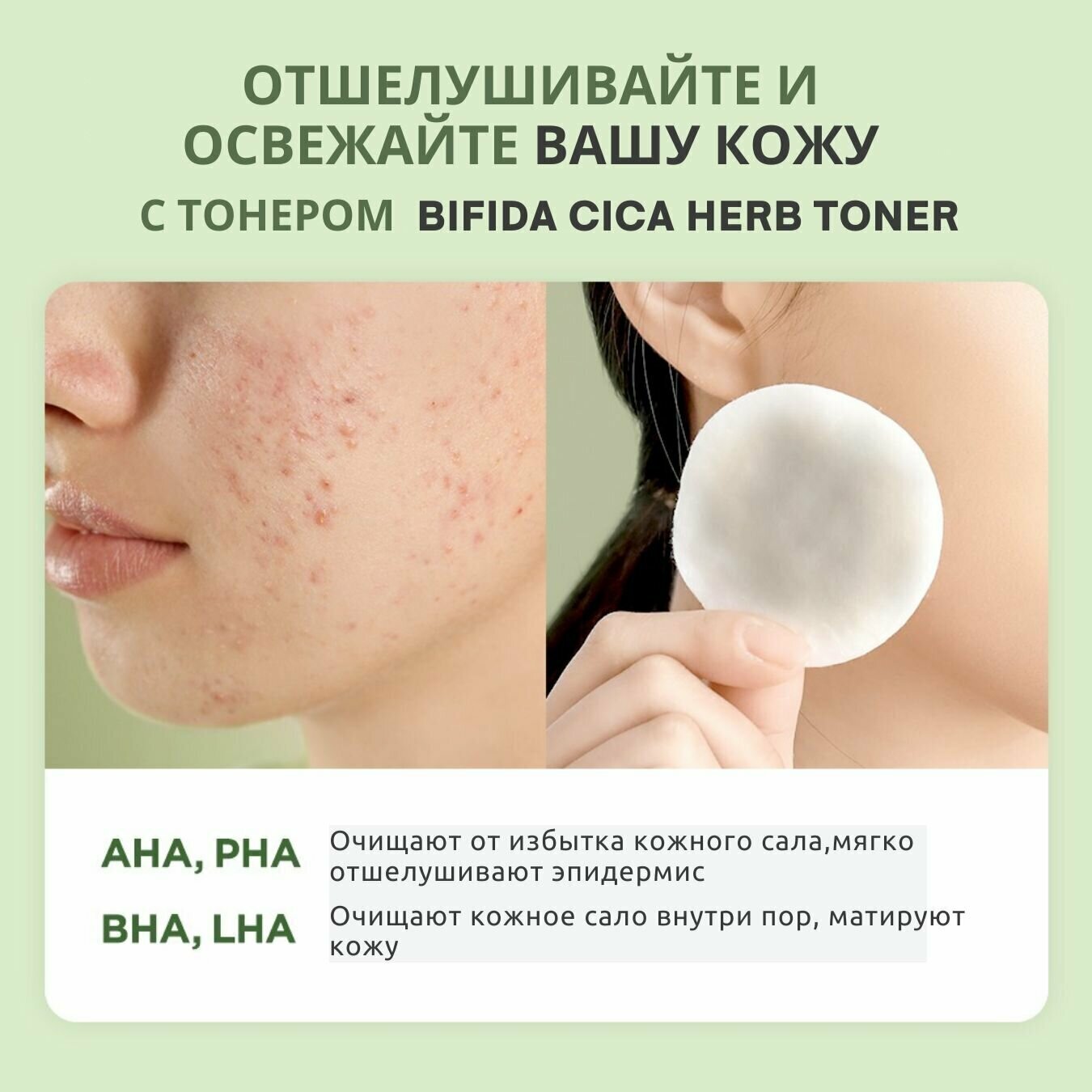 Энергетический тонер Bifida Cica Herb Toner на основе комплекса лизата бифидобактерий для восстановления микробиома кожи в усиленной формуле с экстрактом центеллы азиатской и 12 природными «зелёными» экстрактами, которые в считаные секунды успокаивают, снимают дискомфорт и красноту после умывания. В составе также микс кислот AHA/BHA/PHA/LHA, которые придают коже гладкость и свежесть, выравнивают тон и стирают следы усталости, а также нормализуют работу сальных желёз, очищают от чёрных точек и предотвращают закупоривание пор, оздоравливая и преображая кожу лица.