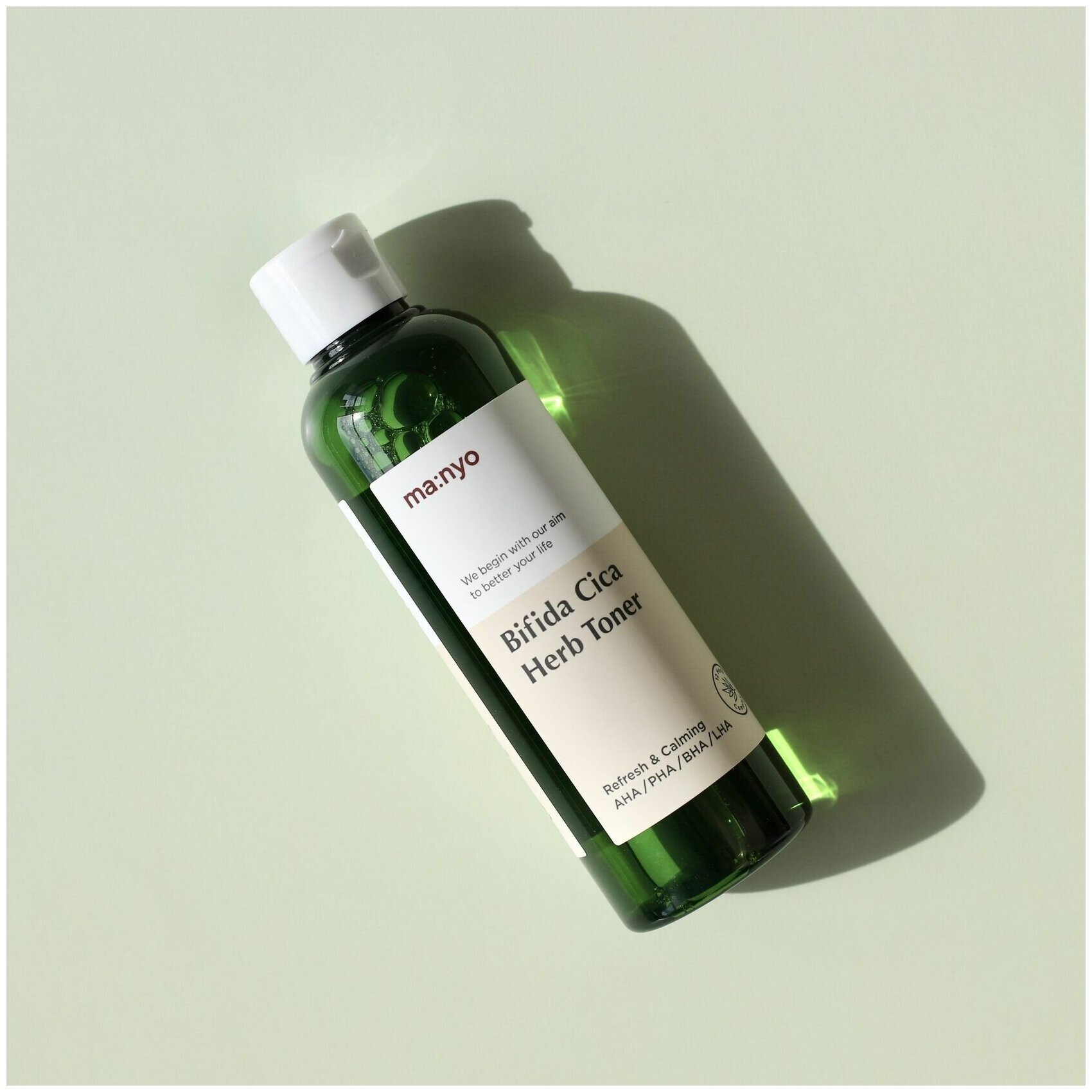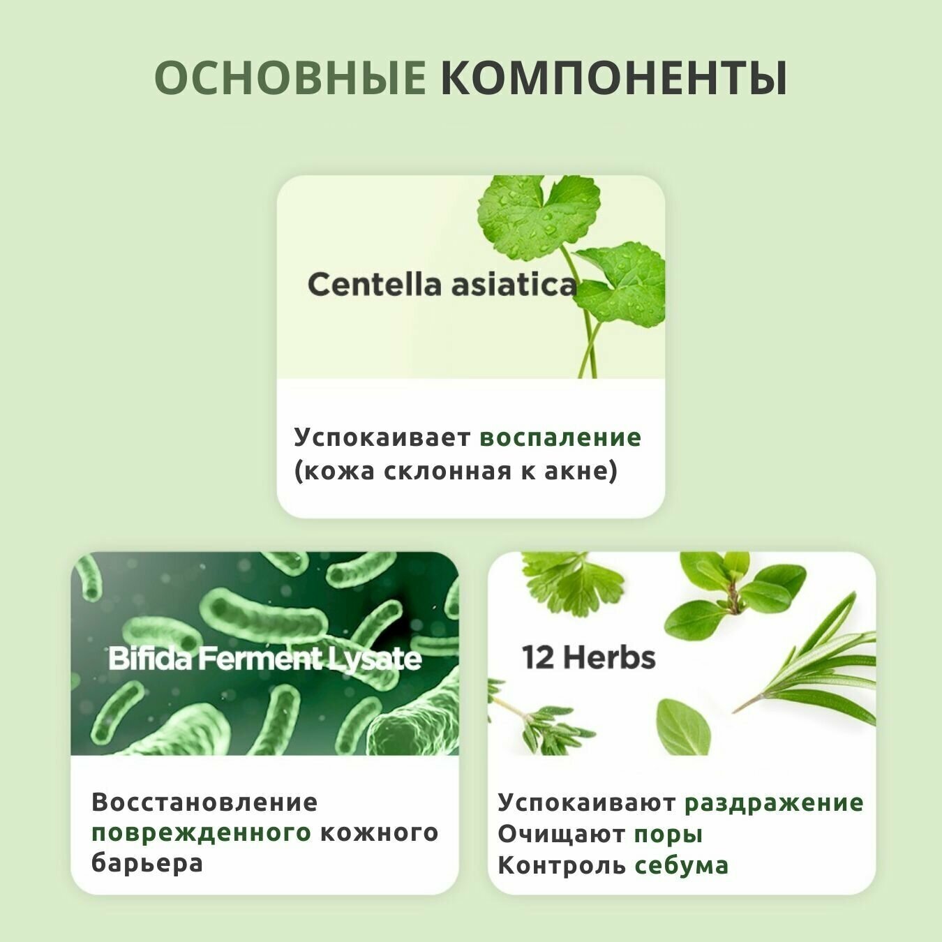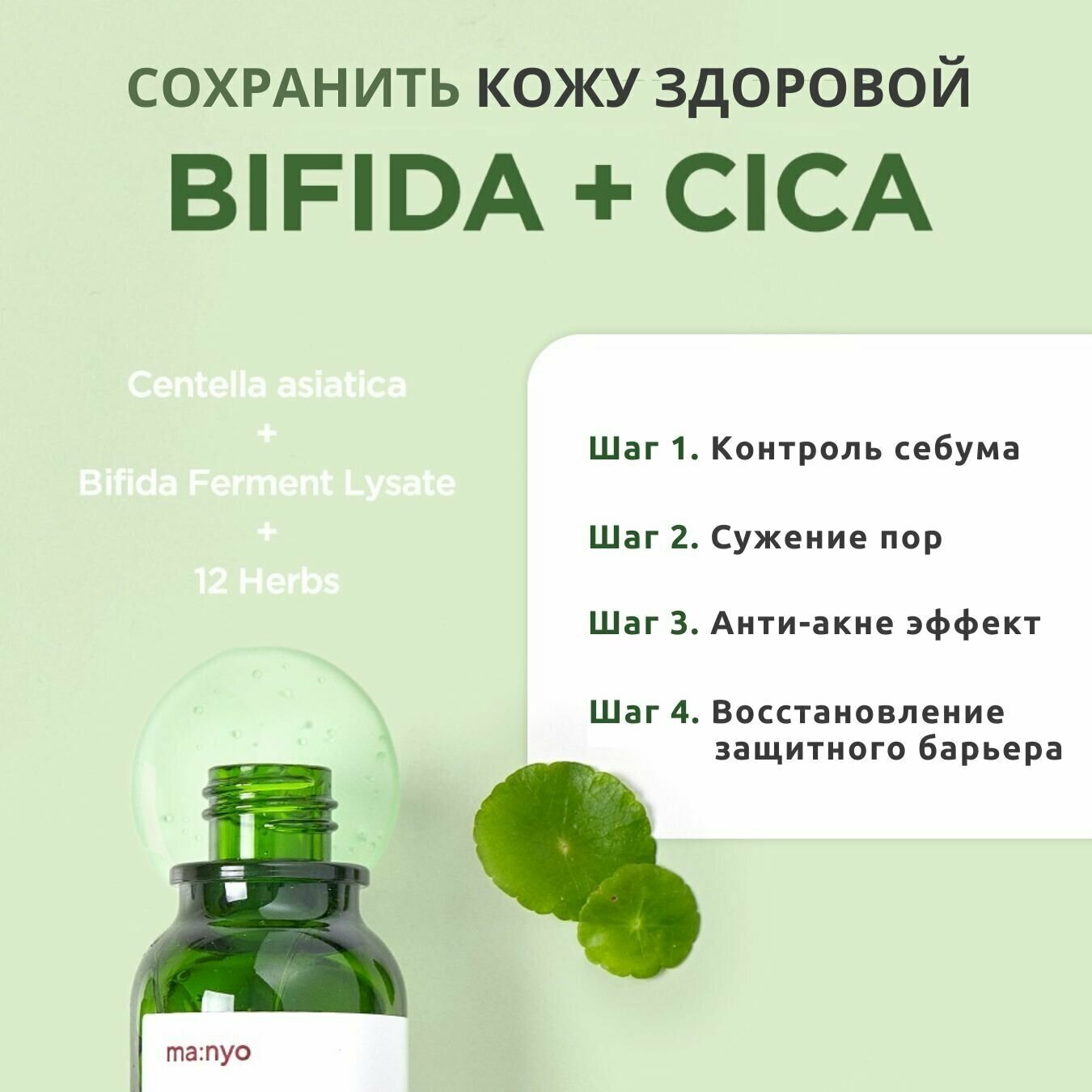 Энергетический тонер Bifida Cica Herb Toner на основе комплекса лизата бифидобактерий для восстановления микробиома кожи в усиленной формуле с экстрактом центеллы азиатской и 12 природными «зелёными» экстрактами, которые в считаные секунды успокаивают, снимают дискомфорт и красноту после умывания. В составе также микс кислот AHA/BHA/PHA/LHA, которые придают коже гладкость и свежесть, выравнивают тон и стирают следы усталости, а также нормализуют работу сальных желёз, очищают от чёрных точек и предотвращают закупоривание пор, оздоравливая и преображая кожу лица.