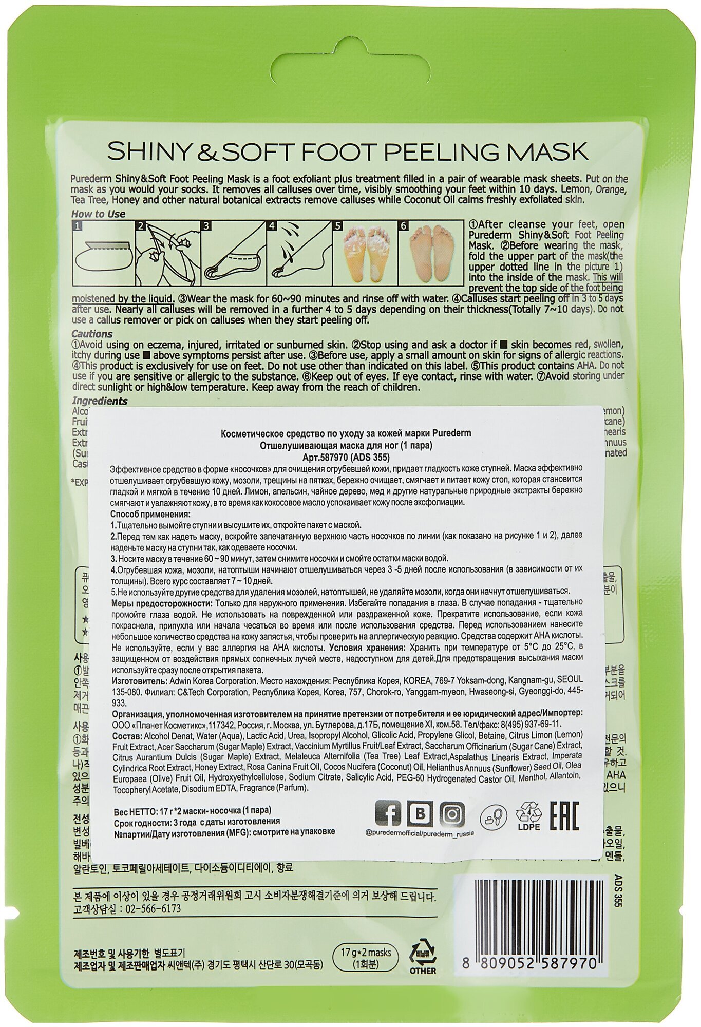 Маска-пилинг для ног Purederm Shiny & Soft Foot Peeling Mask подходит для всех типов кожи и может использоваться ежедневно. Не содержит спирта, ароматизаторов, парабенов, силиконов и сульфатов.