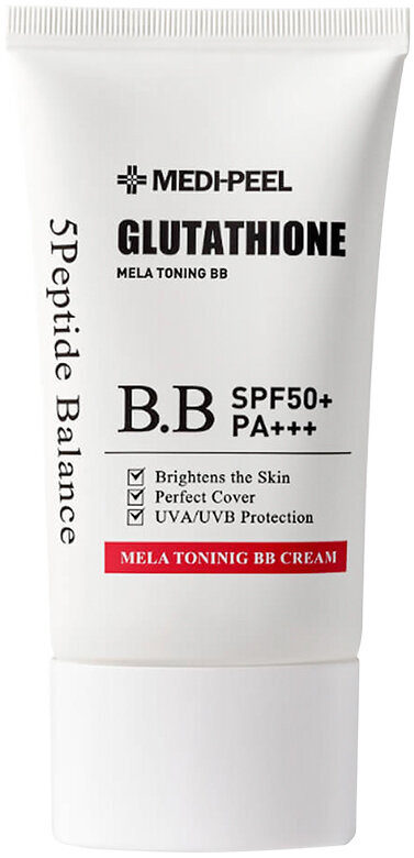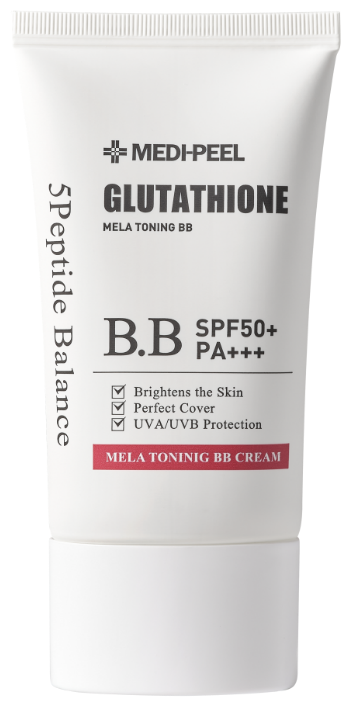 Тональная основа MEDI-PEEL Bio-Intense Glutathione Mela Toning BB Cream SPF50, выравнивает тон кожи и защищает её от воздействия UVA и UVB излучения. Благодаря комплексу Airy Cover, который включает в себя аминокислоты и глутатион, BB крем предотвращает появление пигментации и способствует её осветлению. Средство обладает невесомой текстурой, обеспечивая матовое и комфортное покрытие, при этом не создавая эффекта маски на лице. Цвет крема - темно-бежевый. Крем подойдет для тех, кто хочет: - Естественное покрытие - Нежирный финиш - Чистый тон и яркий цвет лица - Уход за кожей - Защиту от солнца Преимущества средства: 1. BB крем с эссенцией глутатиона выравнивает текущую пигментацию и подавляет образование новой. 2. Формула крема, которая сочетает в себе аминокислоты для покрытия и эссенцию глутатиона, идеально скрывает недостатки, поры и неровности, оставляя мягкое покрытие без липкости. 3. Уникальная смесь MEDI-PEEL, состоящая из 5 пептидов и 5 органических масел, обеспечивает стойкое покрытие, не пересушивая кожу, и не допуская осыпания тональной основы. 4. Осветляющие запатентованные натуральные экстракты обеспечивают чистый тон кожи и ее сияние в течении дня. 5. Защита от UVA/UVB SPF50 PA++++ Смесь физических и химических фильтров. Активные компоненты: Bis-Ethylhexyloxyphenol Methoxyphenyl Triazine - один из лучших солнцезащитных фильтров, известных на сегодняшний день. Иначе называется Тиносорб S. Это химический солнцезащитный фильтр, охватывающий широкий спектр излучения — весь диапазон UVB и UVA, 280-400 нм, с максимальной защитой приблизительно при 310 и 345 нм. Аминокислоты в составе способствуют регенерации кожи лица, препятствуя появлению морщин и восстанавливая её упругость и эластичность. А также препятствует тэпв, сохраняя оптимальный уровень увлажнённости кожи. Глутатион (600 ppm)– низкомолекулярный трипептид, хорошо усваивается нашей кожей, оказывая мощное антиоксидантное воздействие. Нивелируя оксидативный стресс, глутатион препятствует фотостарению, оказывает комплексную детоксикацию, осветляет, выравнивает тон кожи, придавая ей здоровое сияние. Комплекс Anti-Sebum P - комплекс из 4-х видов растительных экстрактов, который направлен на нормализацию работы сальных желез, способствует улучшению рельефа кожи, снимает раздражения. Запатентованный пептидный комплекс Medifil обеспечивает ровное, стойкое покрытие и увлажнение в течении дня. Комплекс из 5 пептидов разглаживает морщины, возвращает коже природную гладкость и упругость, стимулирует синтез коллагена, эластина и гиалуроновой кислоты.