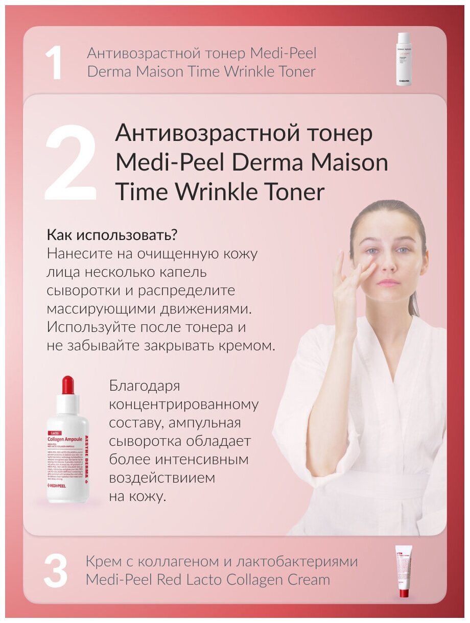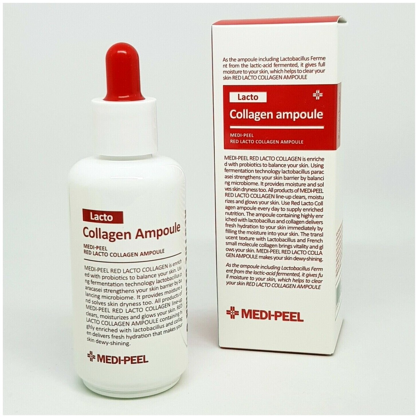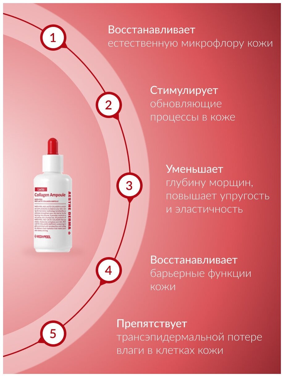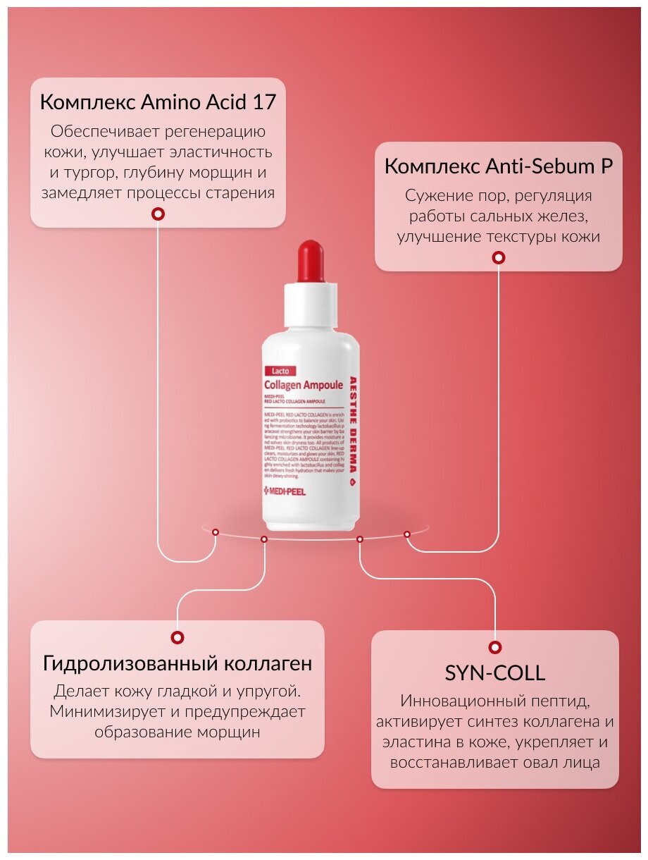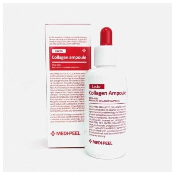 Коллагеновая ампула с лактобактериями и аминокислотами Medi-Peel Red Lacto Collagen Ampoule делает кожу более плотной и крепкой, разглаживает микрорельеф, восстанавливает упругость и эластичность. Ампула обладает подтягивающим действием, подтягивает кожу, за счёт чего помогает сузить расширенные поры, улучшает текстуру кожи.