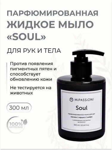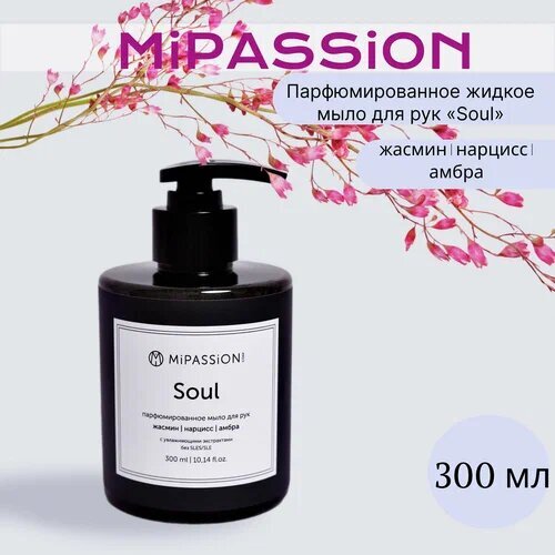 Парфюмированное жидкое мыло для рук и тела MiPASSiON «Soul» с ароматом жасмина, нарцисса и амбры, объемом 300 мл, станет незаменимым помощником в уходе за кожей.