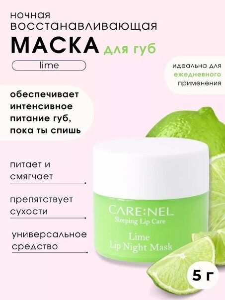 Выбирая ночную маску для губ CARE NEL с ароматом лайма, вы получаете эффективное средство для ухода за кожей губ, которое обеспечивает глубокое увлажнение, питание, восстановление и защиту.