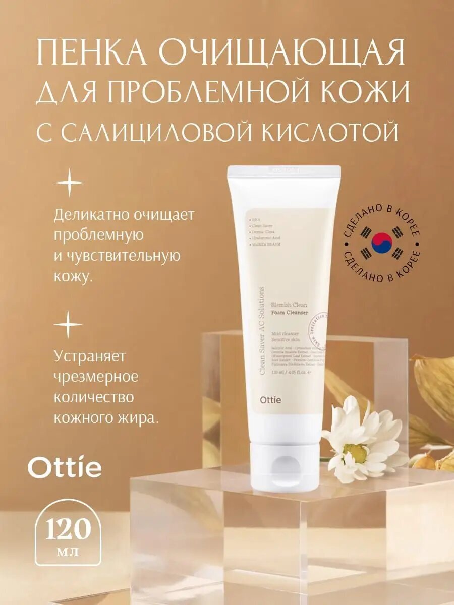 Очищающая пенка Ottie Blemish Clean Foam Cleanser предназначена для проблемной кожи лица. Объем составляет 120 мл, что делает ее экономичным вариантом для ежедневного использования.