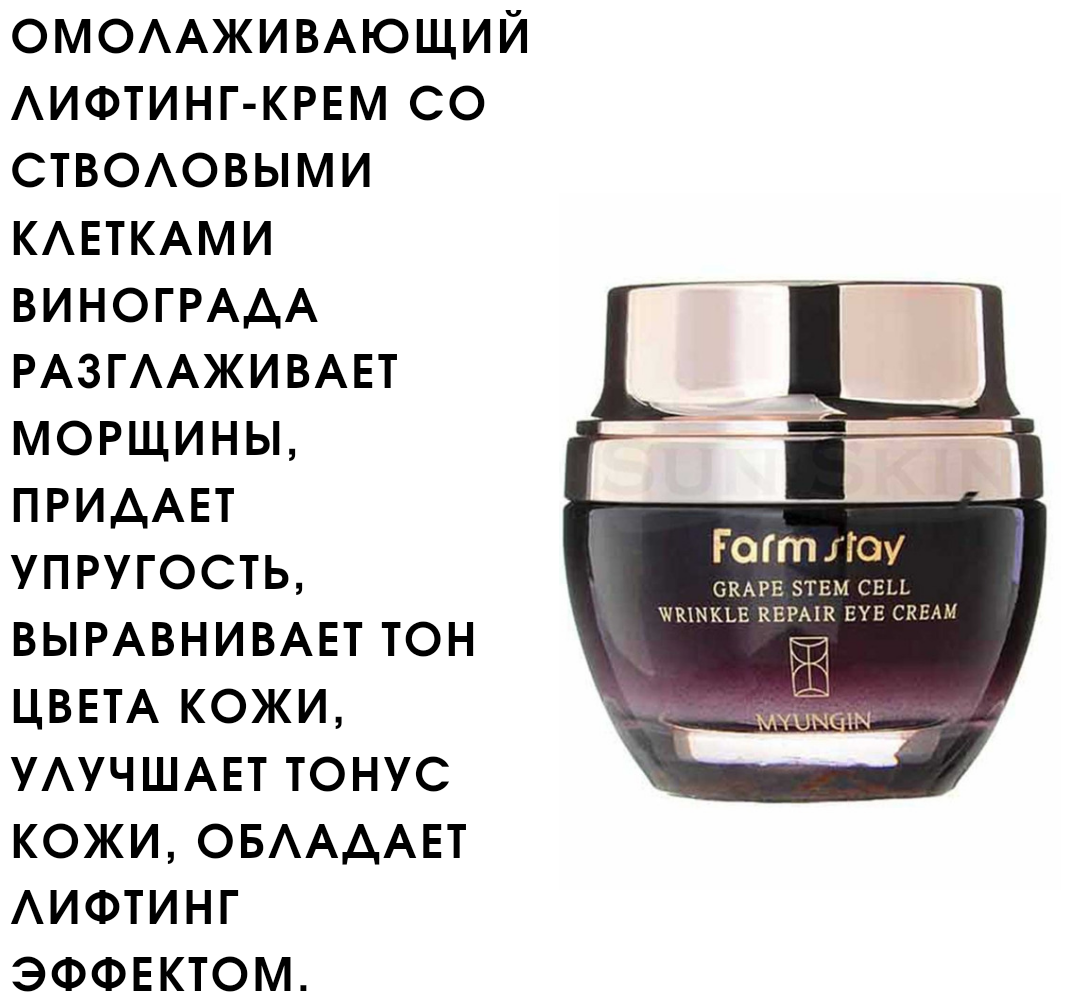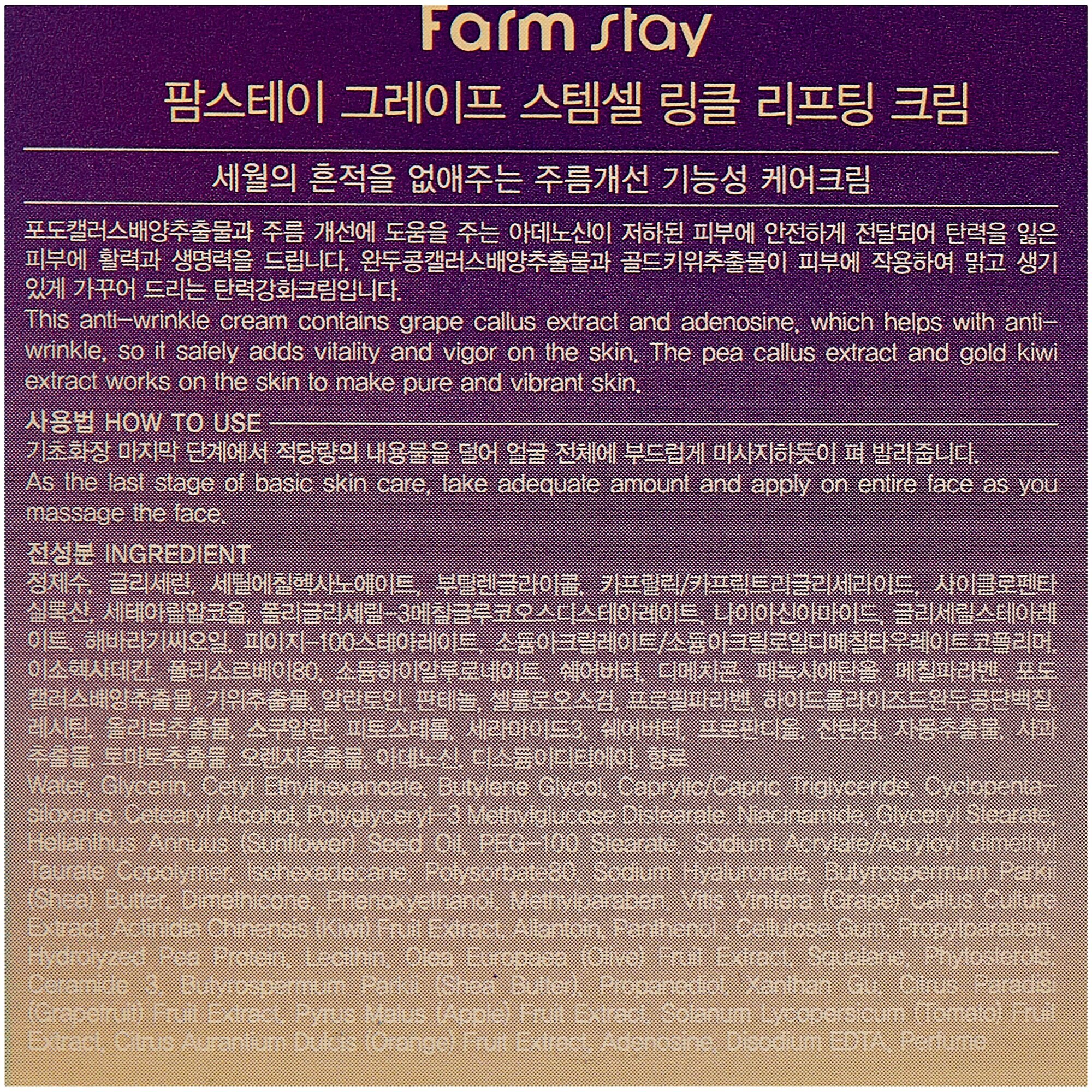 Крем Farmstay Grape Stem Cell Wrinkle Repair Eye Cream увлажняет кожу и насыщает ее питательными компонентами, устраняет дряблость и подтягивает кожу, делая взгляд более открытым. Экстракт стволовых клеток винограда стимулирует все процессы в клетках и регенерацию, витамины A и C дарят упругость и эластичность эпителию, а виноград запускает обменные процессы, восстановление, увлажнение и тонизацию.