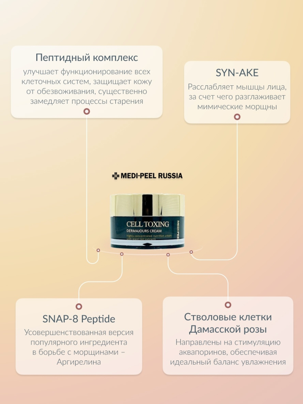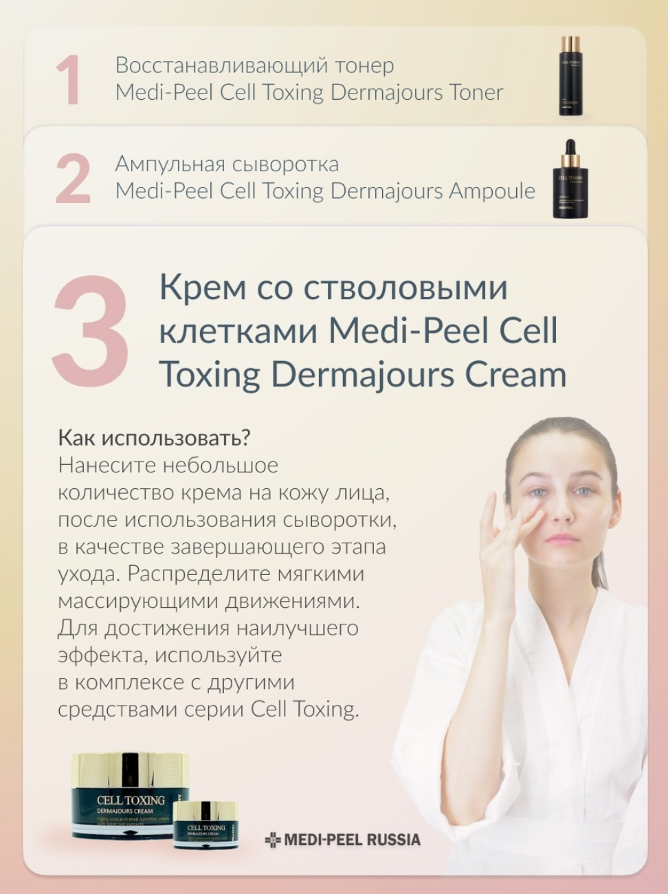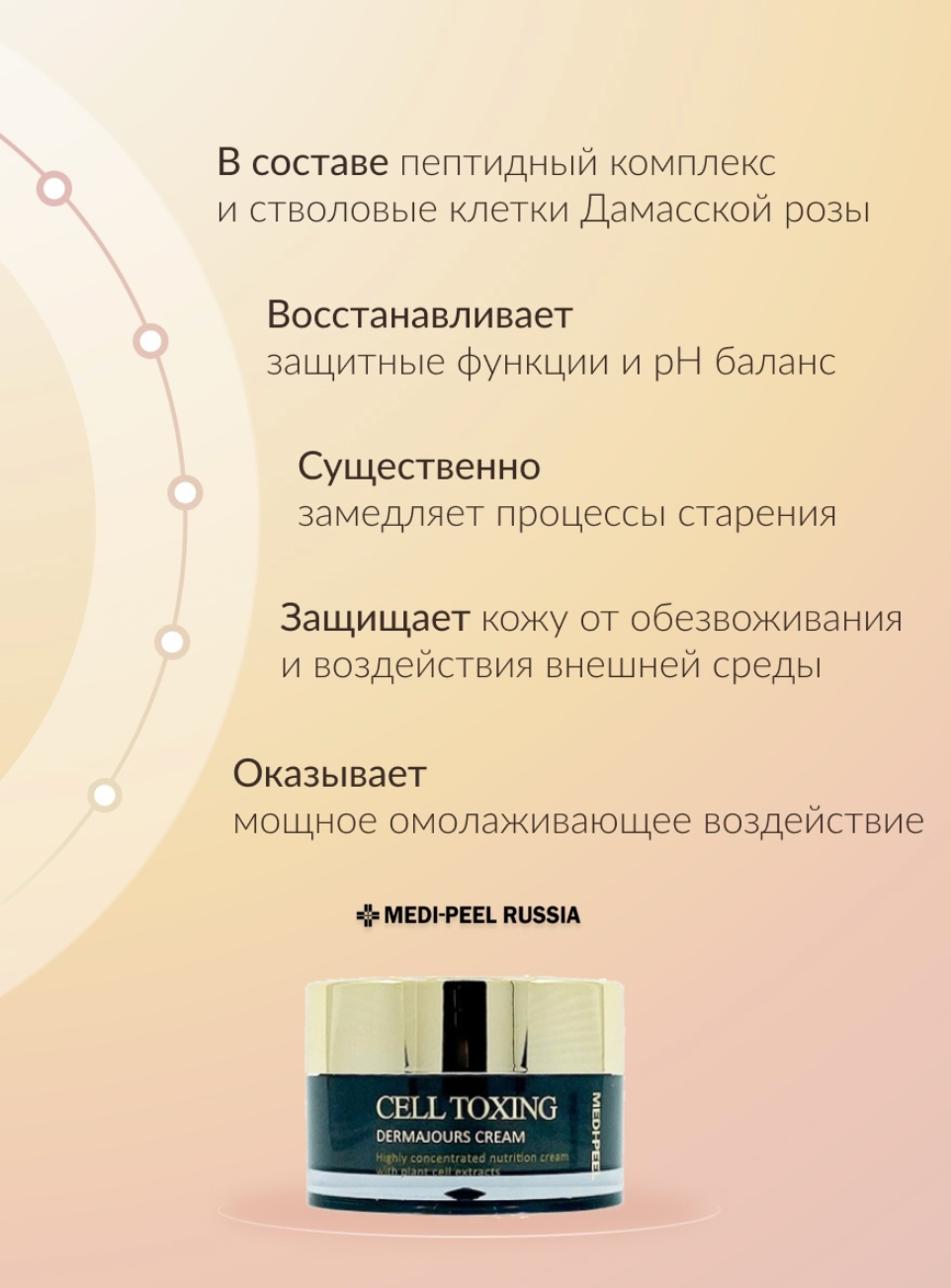 Омолаживающий крем со стволовыми клетками Medi-Peel Cell Toxing Dermajours Cream эффективно восстанавливает тургор кожи, повышая упругость и эластичность тканей, укрепляя и подтягивая овал лица. Крем оказывает действие лифтинга, активно борется с признаками старения кожи, разглаживает и сокращает глубину морщин, а также поддерживает здоровье эпидермиса. Продукт повышает иммунитет кожи, насыщает энергией, возвращает тонус и здоровое сияние.