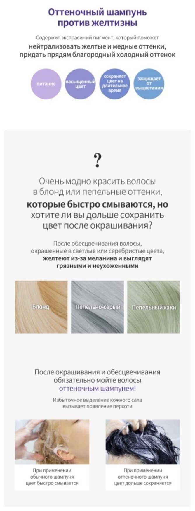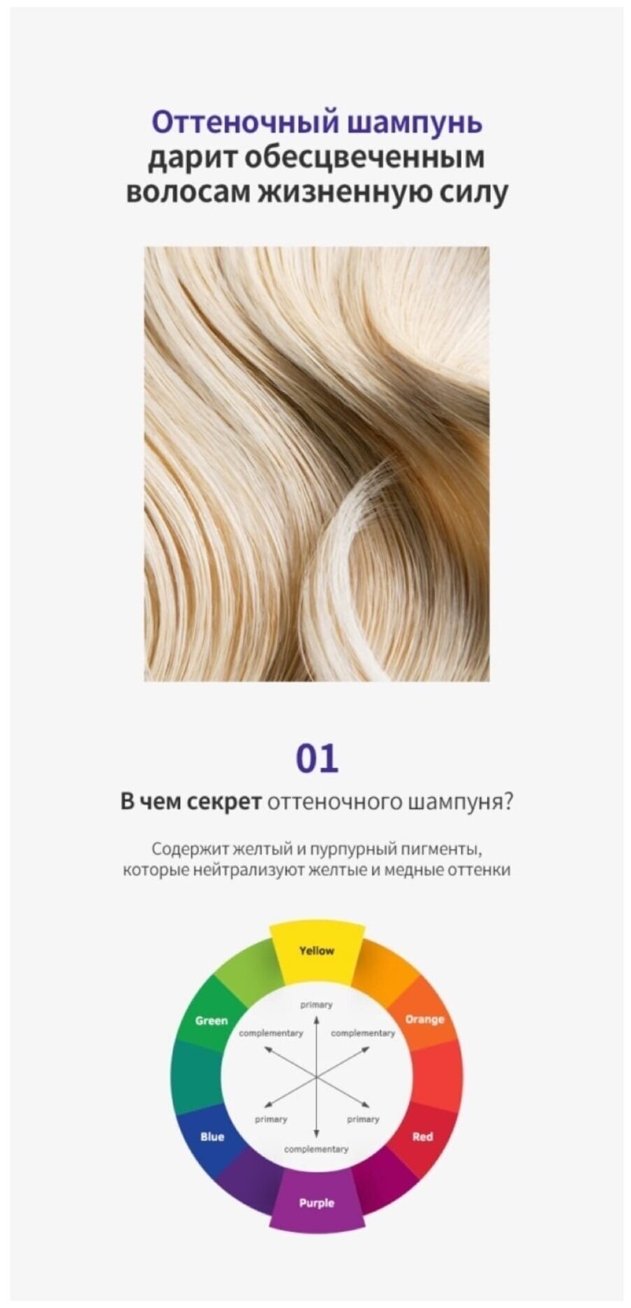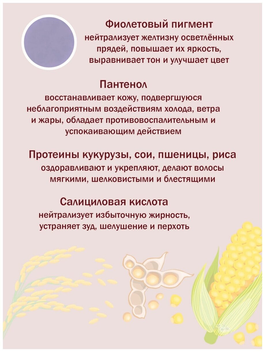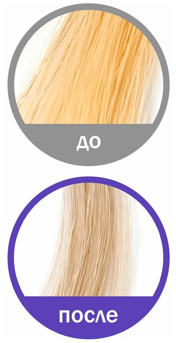 Шампунь содержит специальный фиолетовый пигмент, который нейтрализует желтизну осветленных волос, повышает их яркость и улучшает цвет. Он усиливает природный блеск волос, придавая им ледяные белые и прохладные платиновые тона.