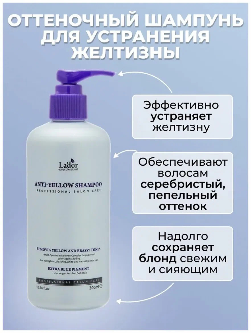 Оттеночный шампунь La'dor Anti Yellow Shampoo - это профессиональное средство для ухода за светлыми волосами. Он эффективно устраняет желтизну, улучшает цвет и состояние волос.