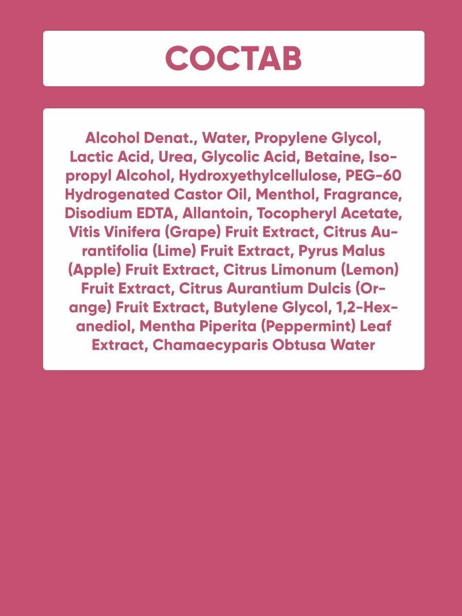 Состав пилинг-носочков включает натуральные экстракты винограда, лимона, апельсина, яблока, мяты, кипариса и другие активные ингредиенты, такие как AHA- и PHA-кислоты, которые обеспечивают глубокое очищение и питание кожи.