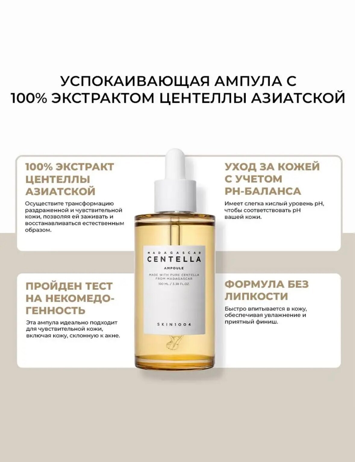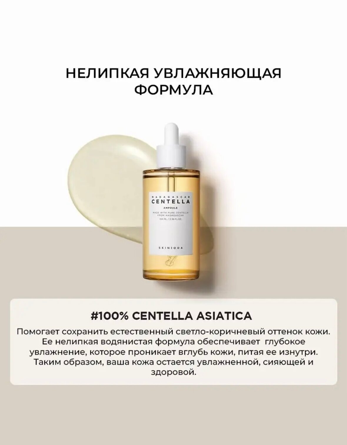 Ампула SKIN1004 Madagascar Centella Ampoule — это высококонцентрированное успокаивающее средство, которое ускоряет заживление ранок и повреждений, интенсивно увлажняет, устраняет раздражение, сухость, покраснение и воспаление, уменьшает акне. Слабокислотная гипоаллергенная формула с pH, схожим с pH здоровой кожи, не нарушает естественный защитный барьер, нормализует баланс влаги и липидов на поверхности эпидермиса. Главный и единственный компонент сыворотки — 100% экстракт центеллы азиатской, извлечённый из растения, произрастающего в экологически чистом районе Мадагаскара. Центелла из Мадагаскара содержит в 7 раз больше азиатикозида. Экстракт центеллы укрепляет сосуды, подавляет воспаление, помогает в борьбе с экземой и куперозом, препятствует появлению сосудистой звёздочки, снижает чувствительность. Лёгкая текстура отлично впитывается, не оставляет липкости, оставляет приятное чувство комфорта и увлажнённости после нанесения.