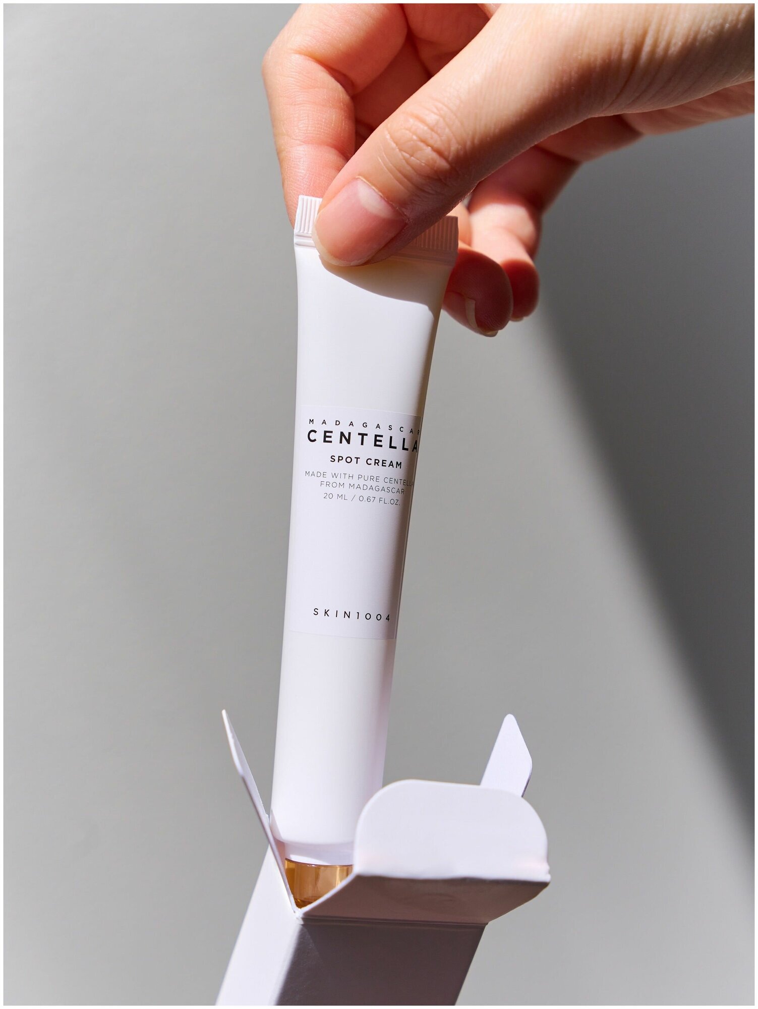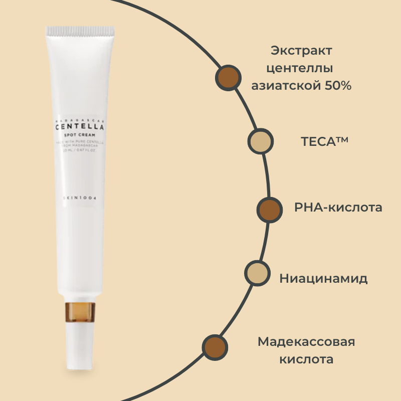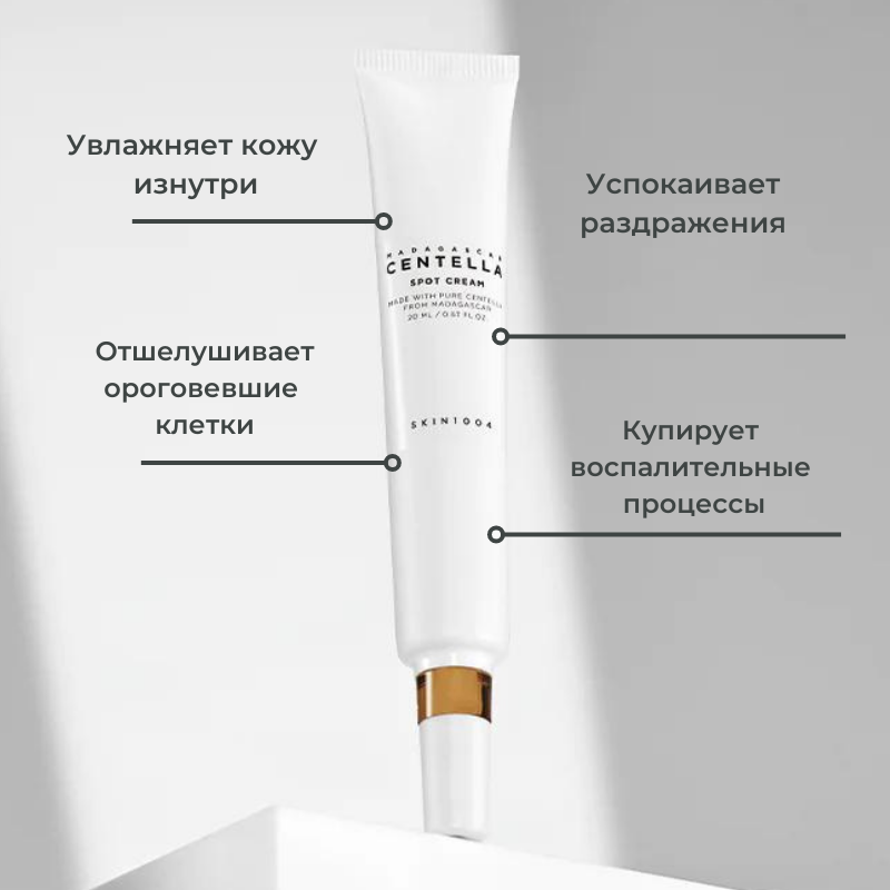 Точечный крем SKIN1004 Madagascar Centella Spot Cream улучшает состояние проблемных участков кожи, которым нужно особенное внимание: успокаивает покраснение, мягко осветляет и отшелушивает, выравнивая микрорельеф.