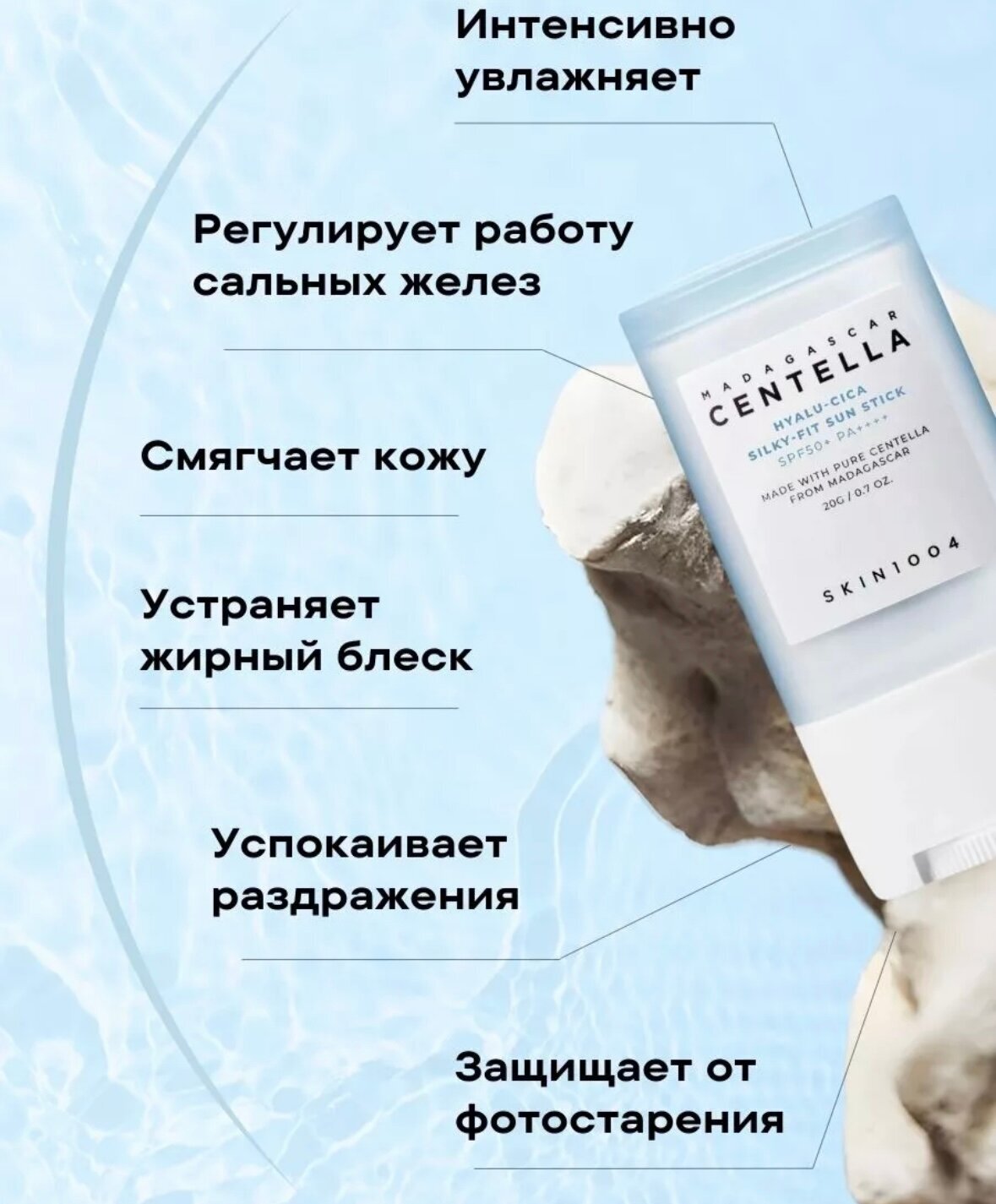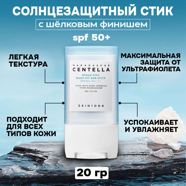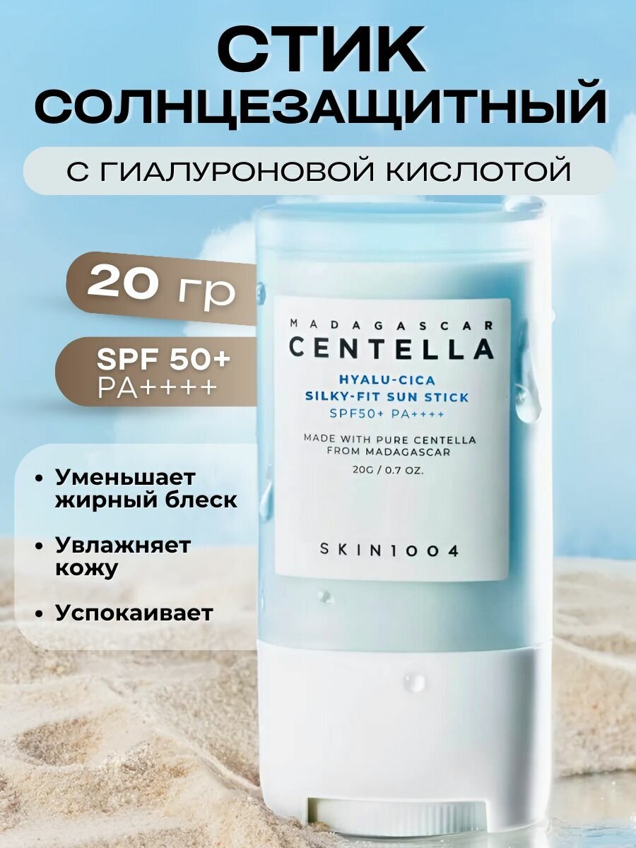 Солнцезащитный стик SKIN1004 Hyalu-Cica Silky-Fit Sun Stick SPF50+ PA++++ обеспечивает максимальную защиту от ультрафиолета, предотвращая покраснение, солнечные ожоги, пигментацию и появление признаков фотостарения.