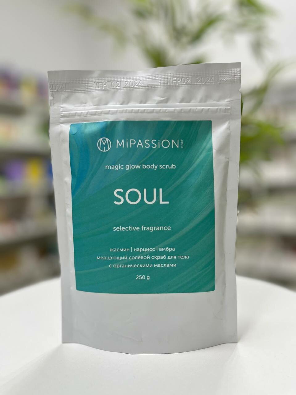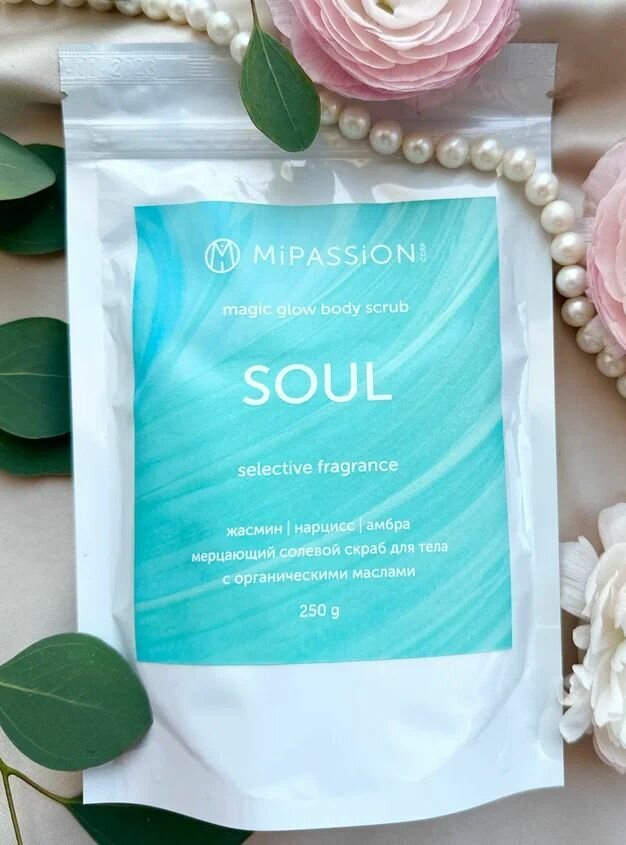 мерцающий скраб «Soul» MiPASSiON объёмом 250 г с ароматами «жасмин», «нарцисс», «амбра»