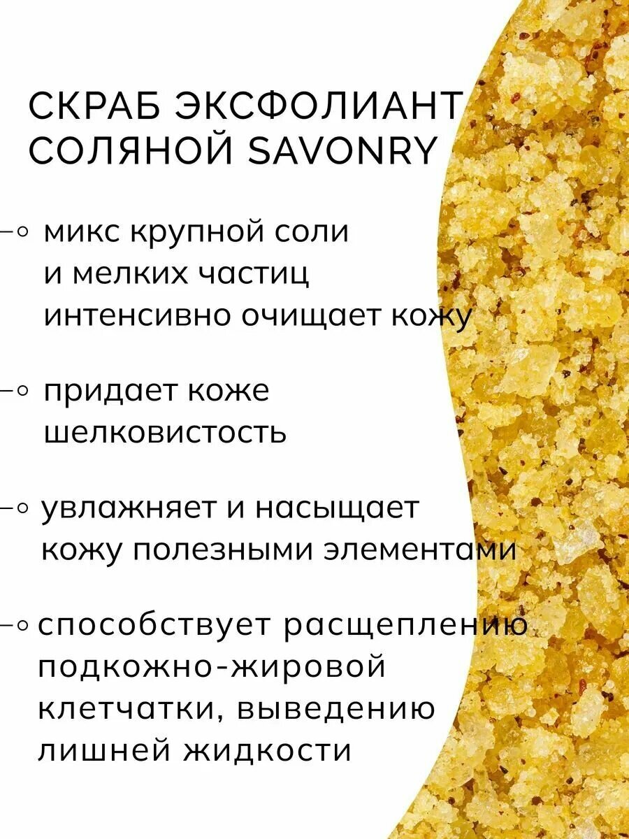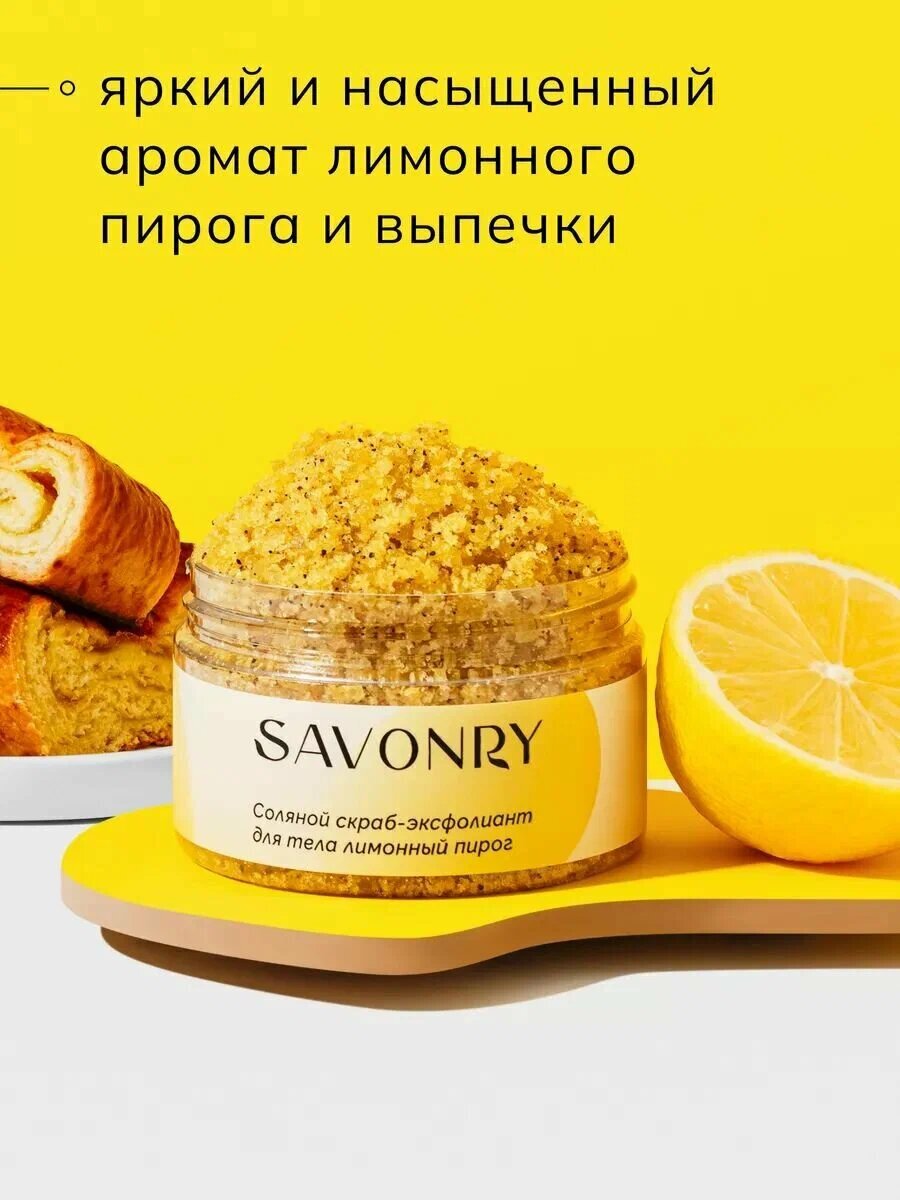 Соляной скраб-эксфолиант для тела "Лимонный пирог" от Savonry - это уникальное сочетание эффективного очищения и увлажнения кожи, а также приятного аромата цитрусовых.