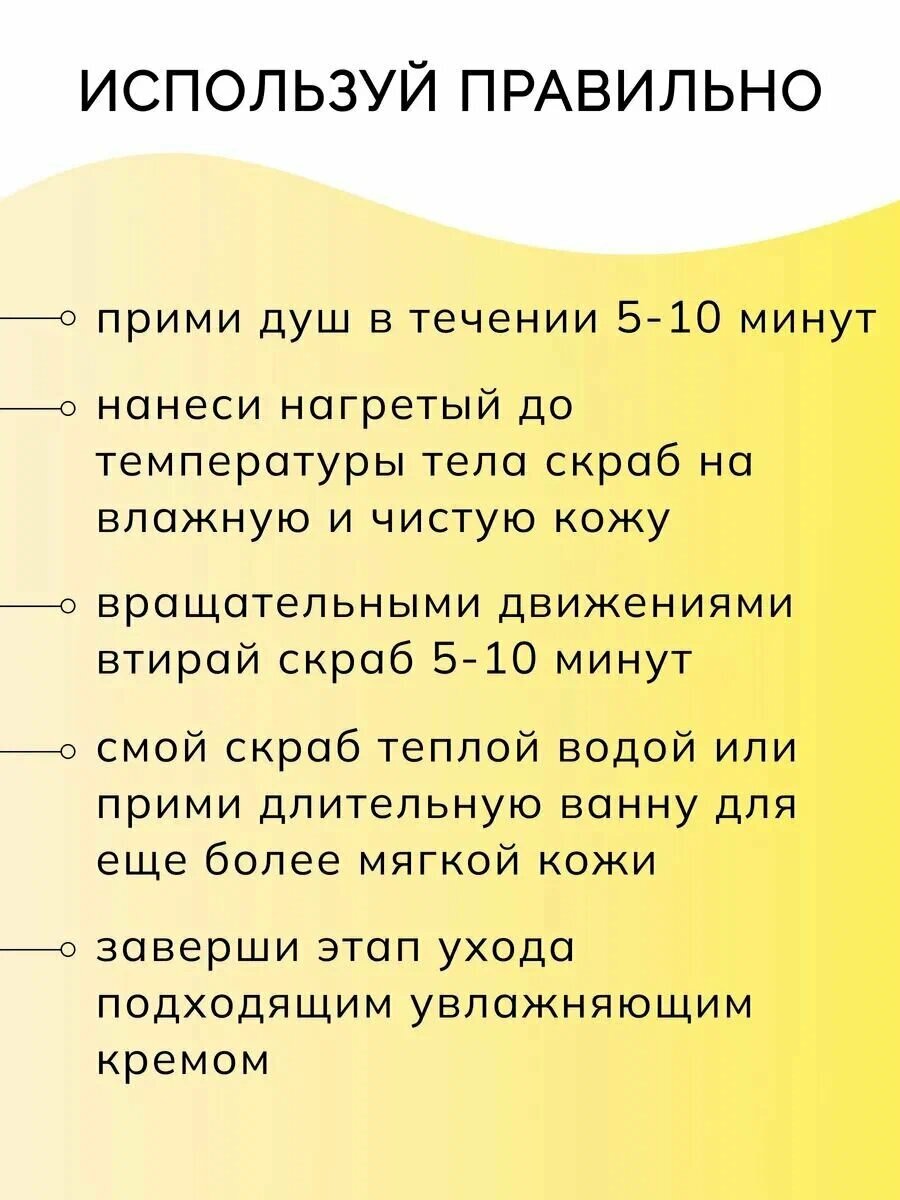 Применение: нанесите необходимое количество скраба на тело массажными движениями во время приема ванны, душа или находясь в бане или сауне. Оставьте на 2-3 минуты и смойте водой. Избегайте попадания на поврежденные участки кожи. Храните в темном прохладном месте при температуре не выше 28°C.