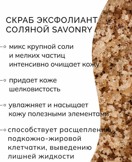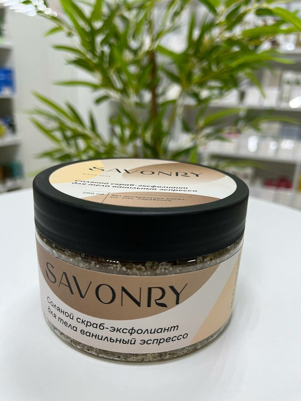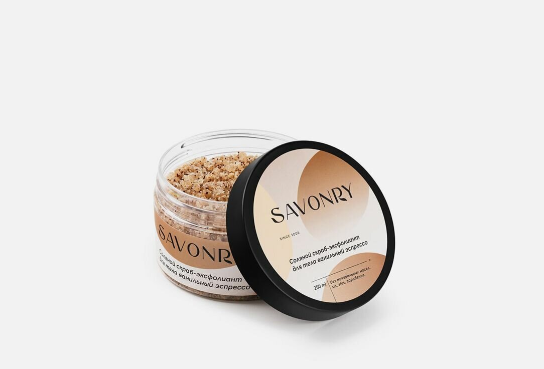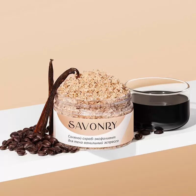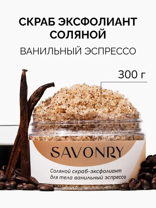 Скраб-эксфолиант соляной для тела Savonry ванильный эспрессо - это мощный двухфазный скраб, который борется с темными пятнами, тусклостью и неровным тоном кожи. Он содержит 15% супервитамина С, который на 1000% усваивается лучше, чем чистый витамин С, обеспечивая сияние и безупречность кожи.