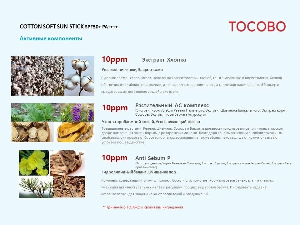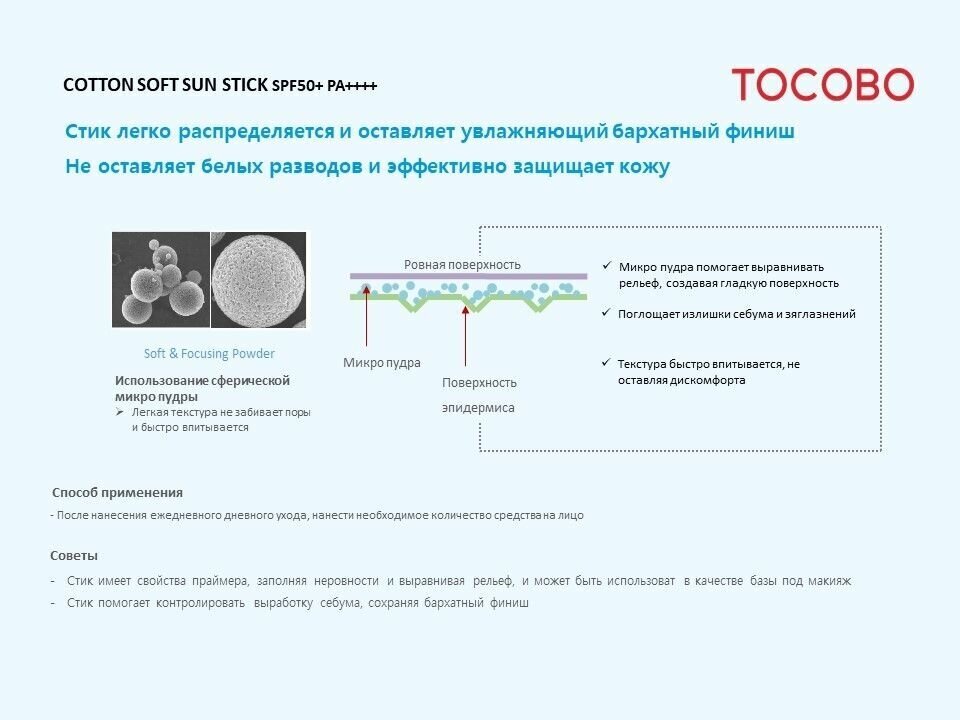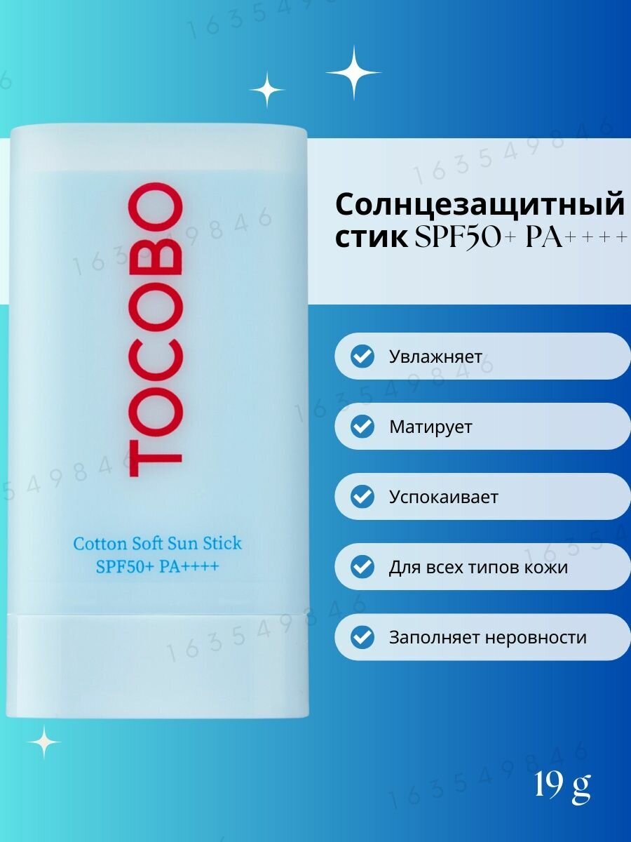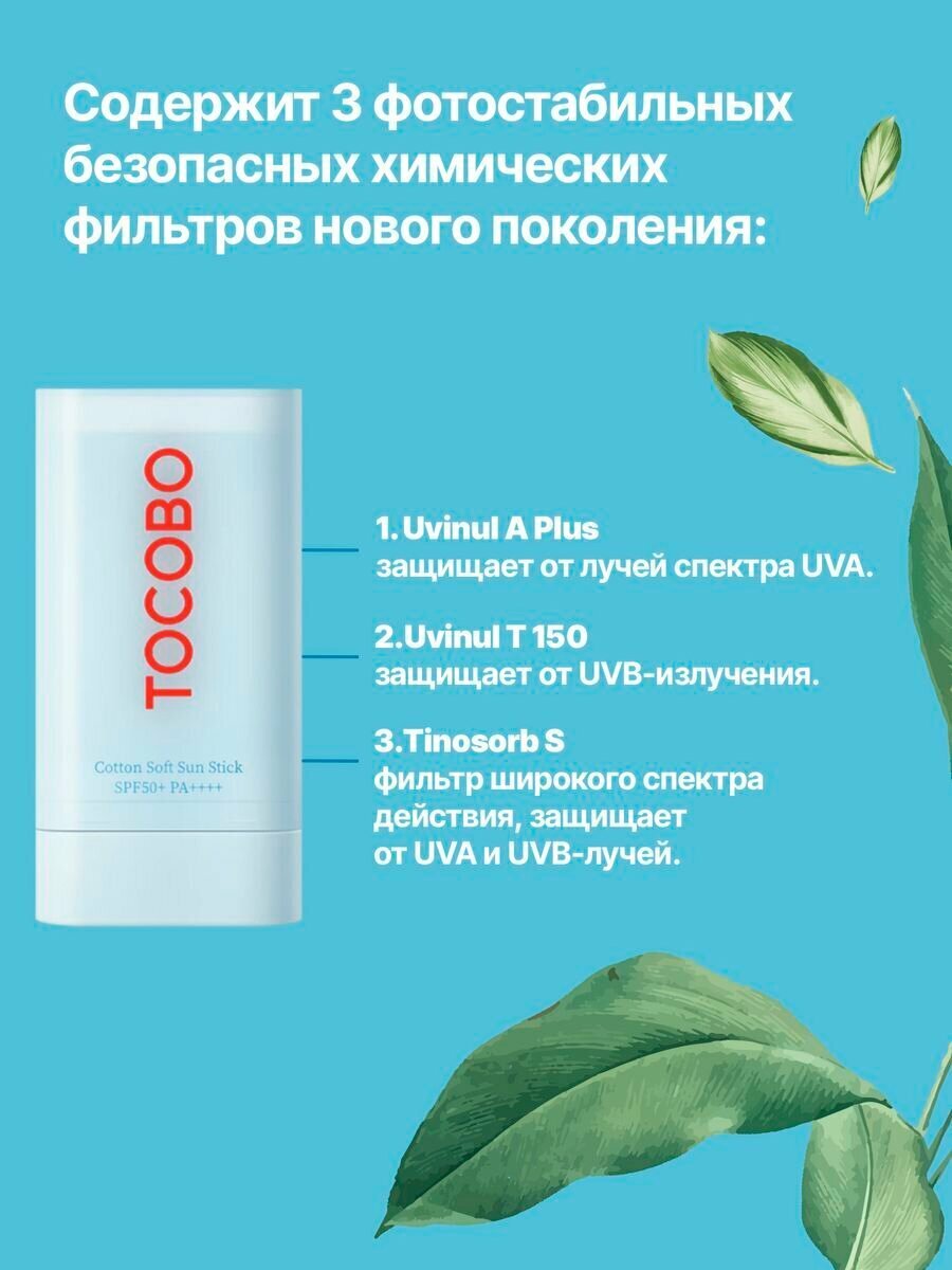Себорегулирующий солнцезащитный стик для лица Tocobo Cotton Soft Sun Stick SPF50+ PA++++ обеспечивает надежную защиту от УФ-излучения и других негативных воздействий окружающей среды.