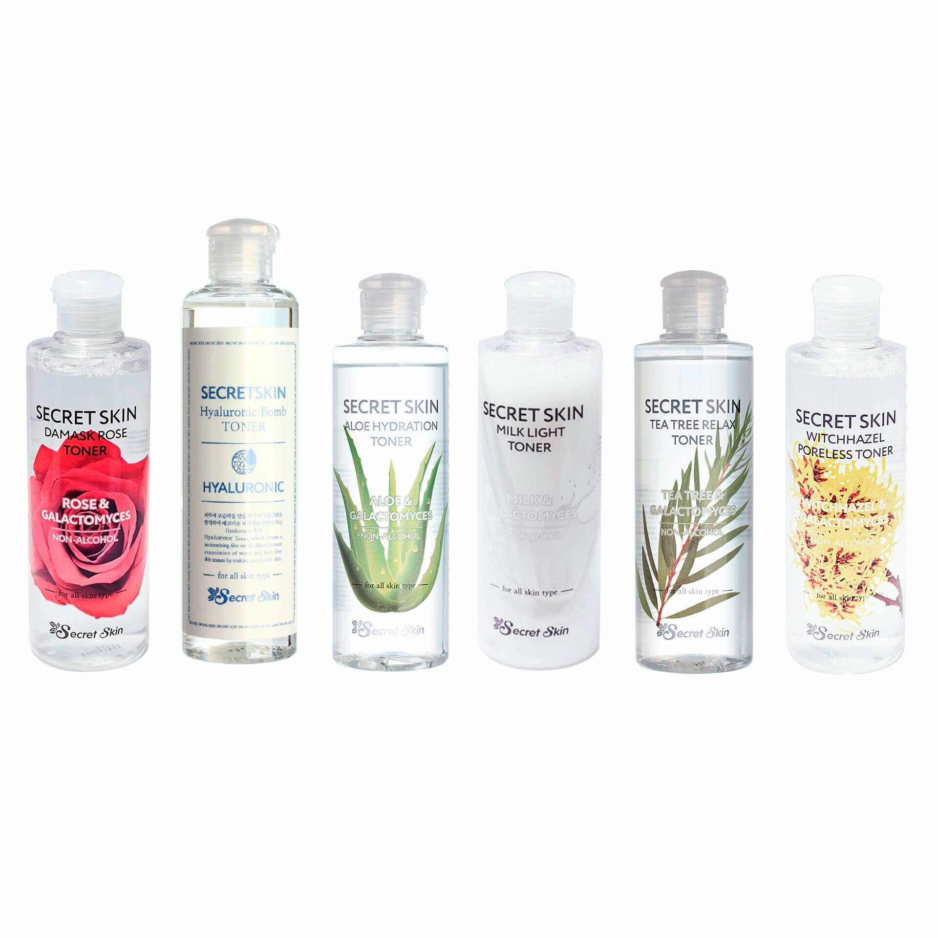 Тонеры для лица с натуральными экстрактами Secret Skin Toner предназначены для эффективного очищения, тонизирования и увлажнения кожи. Каждое средство содержит в своем составе активные компоненты, которые направлены на решение тех или иных задач в рамках ухода за кожей. В линейке представлено шесть видов тоников с органическими экстрактами чайного дерева, гамамелиса, алоэ вера, а также с молочными протеинами, розой дамасской и гиалуроновой кислотой: