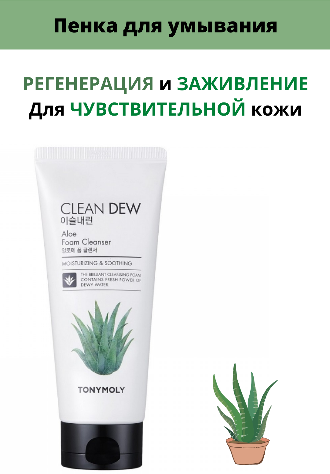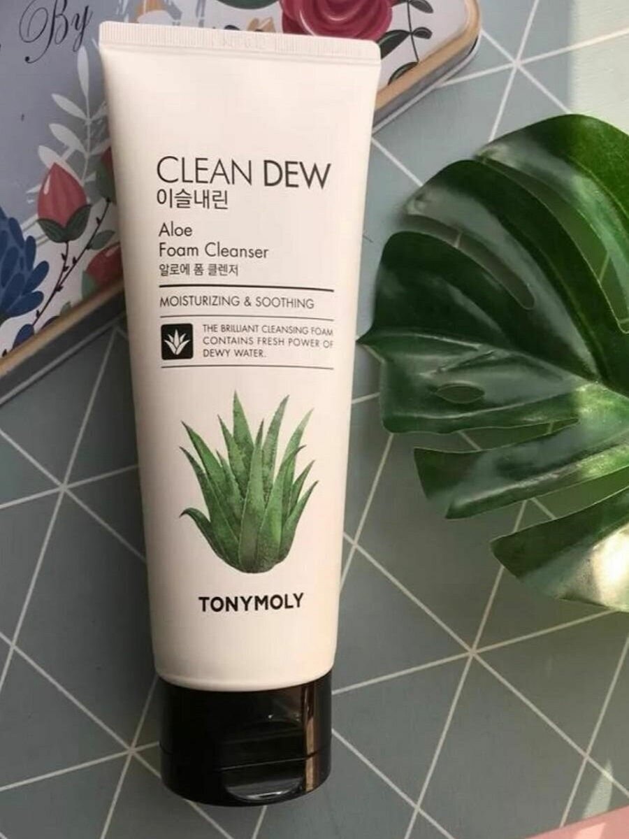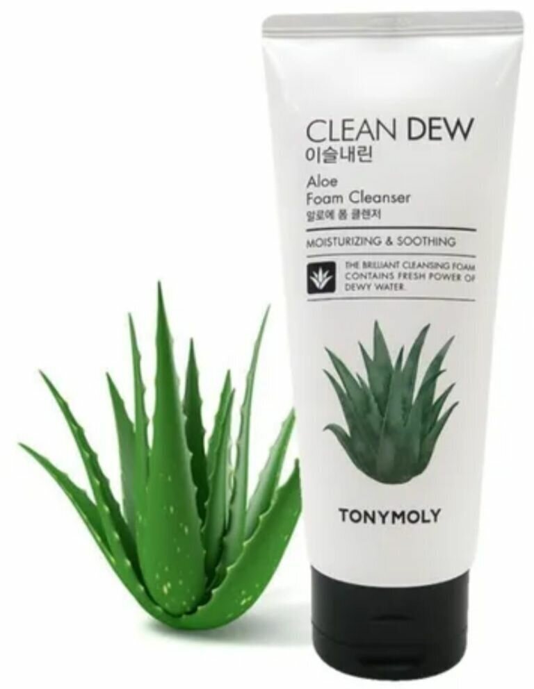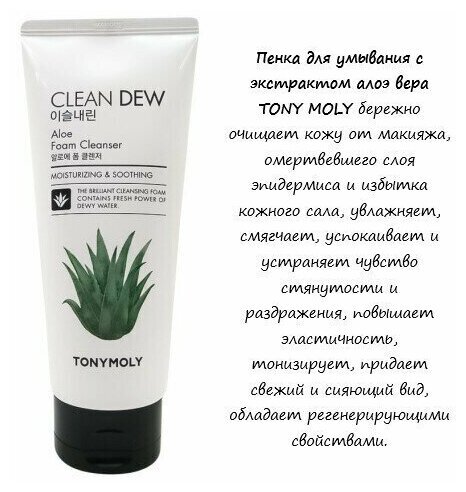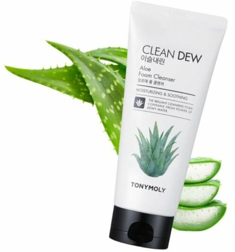 Успокаивающая пенка Clean Dew Aloe Foam Cleanser с экстрактом алоэ от популярного корейского бренда Tony Moly сделает процедуру умывания комфортной, бережно очищая кожу от макияжа, себума и загрязнений. Формула включает ряд активных компонентов, которые оказывают благоприятное влияние на кожу: Экстракт алоэ вера давно известен своими поистине волшебными целебными свойствами и не зря настолько популярен. Алоэ является природным антиоксидантом, эффективно восстанавливает поврежденную и раздраженную кожу, оказывает успокаивающее, увлажняющее и заживляющее действие, устраняет зуд, воспаление и покраснения, смягчает огрубевшие участки. Универсальность алоэ заключается в том, что он идеально работает с любым типом кожи. Гидролат экстрактов кипариса, листьев камелии и чайного дерева оказывает увлажняющее, антибактериальное, противовоспалительное, вяжущее и заживляющее действие. Такой комплекс эффективно выводит шлаки и токсины, выравнивает тон кожи, уменьшает выделение кожного жира, сохраняя свежесть и ощущение чистоты более длительное время. Токоферол (Витамин Е) превосходный эмолент, который смягчает, питает и увлажняет кожу, оказывает успокаивающее и антиоксидантное действие. После умывания кожа наполняется жизненной энергией, обретает свежесть и чистоту. Косметическое средство обладает массой положительных свойств: не вызывает аллергию и раздражение, подходит для любого типа кожи, не пересушивает верхний слой эпидермиса, экономно расходуется, защищает от пагубного воздействия окружающей среды, имеет натуральный состав. Пена от Tony Moly имеет плотную кремовую текстуру, нежный растительный аромат. Хорошо пенится, создавая воздушную массу, которая бережно очищает кожу. Купить корейскую косметику Tony Moly можно в нашем интернет-магазине «Aumishop». Здесь представлена оригинальная продукция по цене производителя. Все позиции протестированы, имеют сертификат качества и одобрены дерматологами. Формула исключает парабены, красители, продукты животного происхождения и другие вредные вещества.
