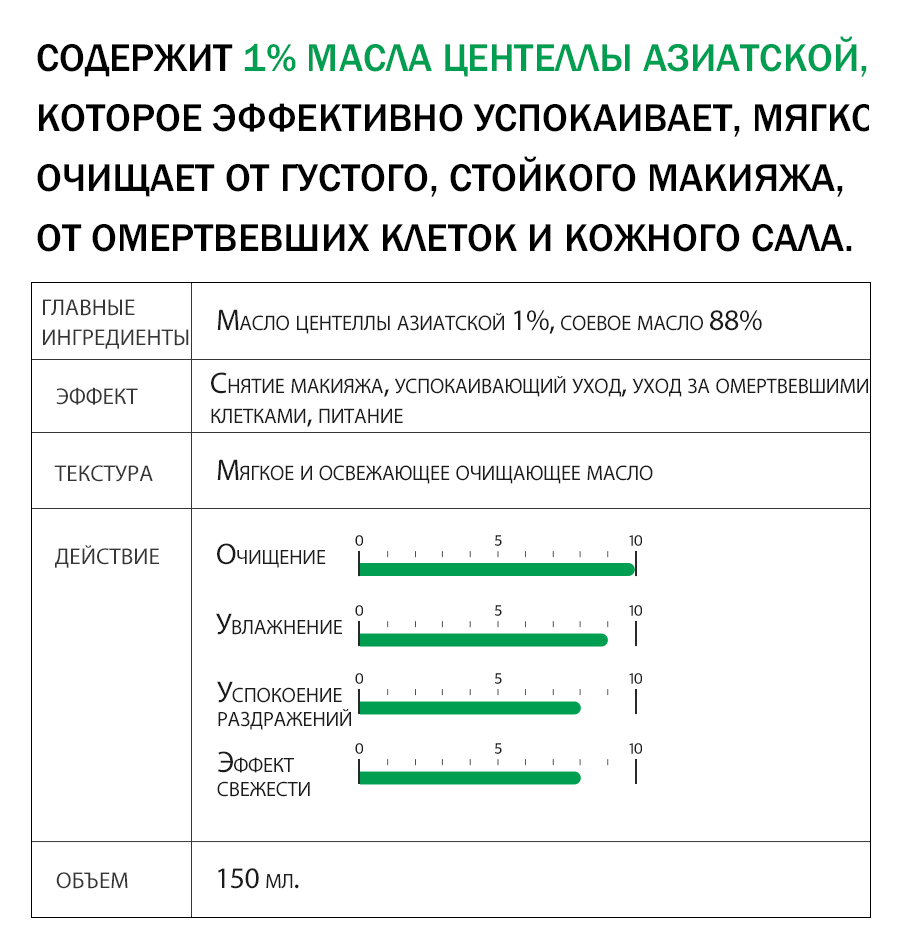 Осветляет сальные нити и чёрные точки, предотвращает закупорку пор и появление воспалений, смывает излишки кожного сала. Не оставляет тяжёлой липкой плёнки, имеет тонкий аромат чайного дерева.Содержит 1% масла центеллы азиатской, извлечённое из растений, произрастающих в экологичном районе Мадагаскара. Центелла успокаивает раздражение и покраснение, избавляет от дискомфорта, увлажняет и питает.