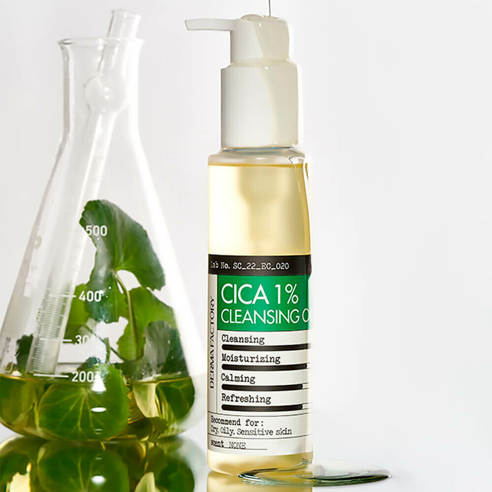 идрофильное масло Derma Factory Cica 1% Cleansing Oil растворяет загрязнения в порах, удаляет макияж, снимает раздражение и оставляет приятное ощущение свежести и комфорта после умывания.