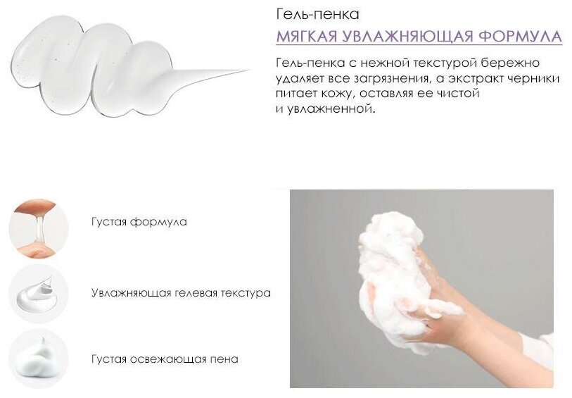Увлажняющая гель-пенка с черникой предназначена для бережного очищения кожи лица и идеально подходит для ежедневного применения. Она устраняет ощущение сухости, очищает и увлажняет. Специальный защитный комплекс помогает очистить кожу от мелкой пыли и других загрязнений.