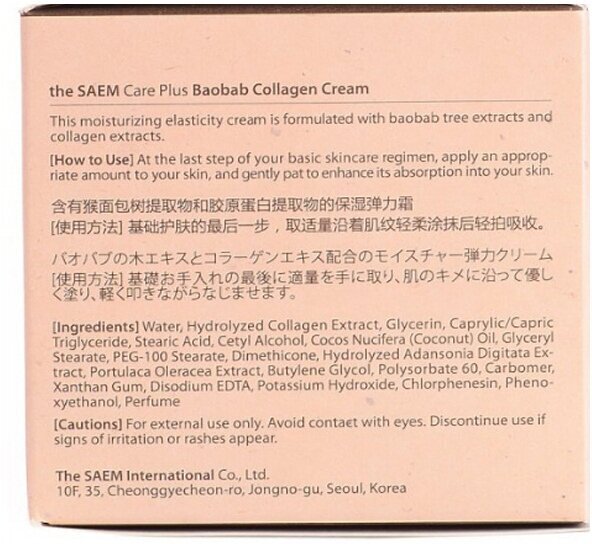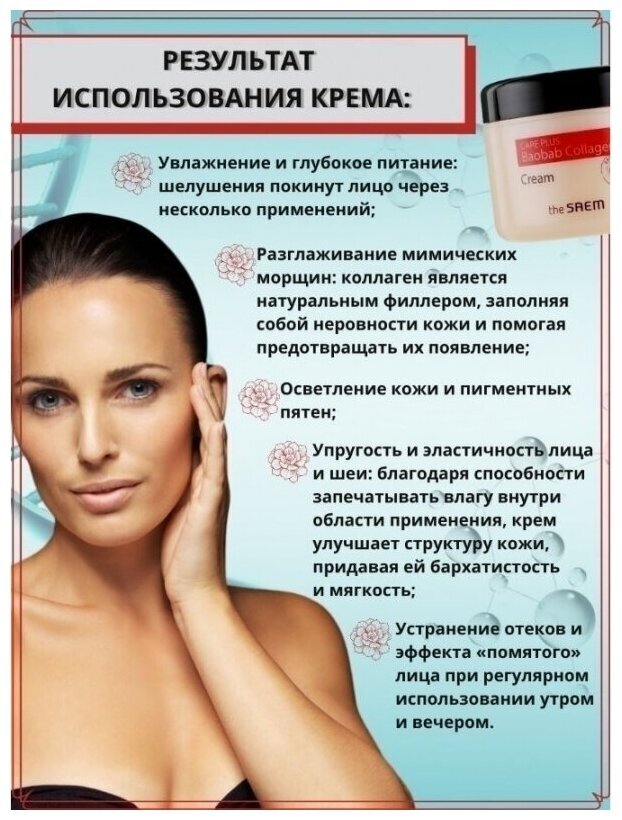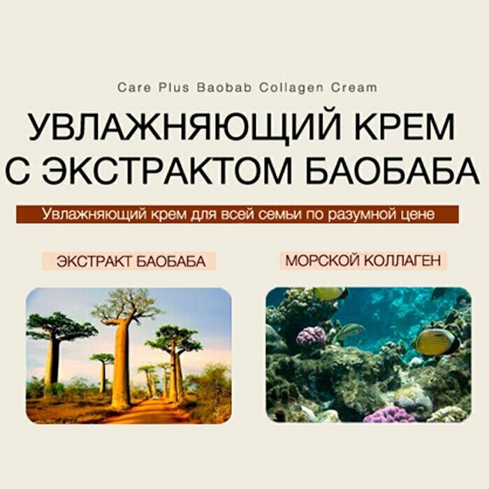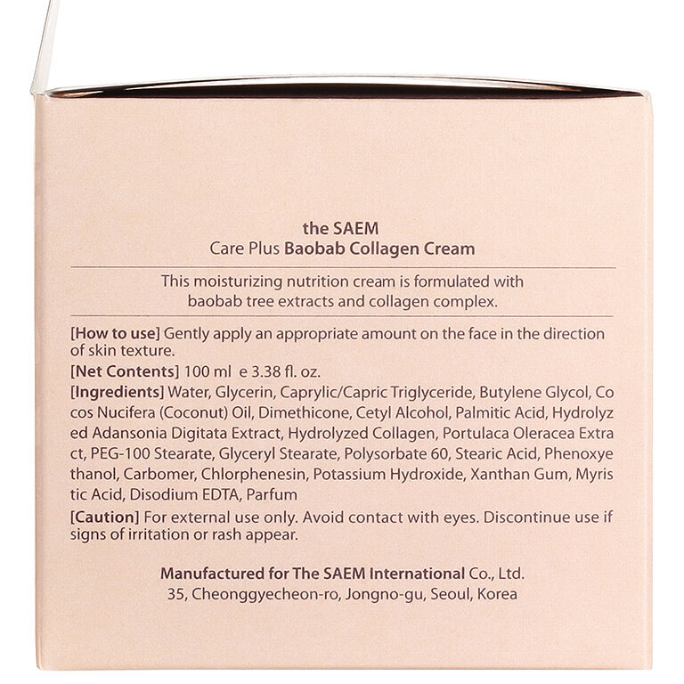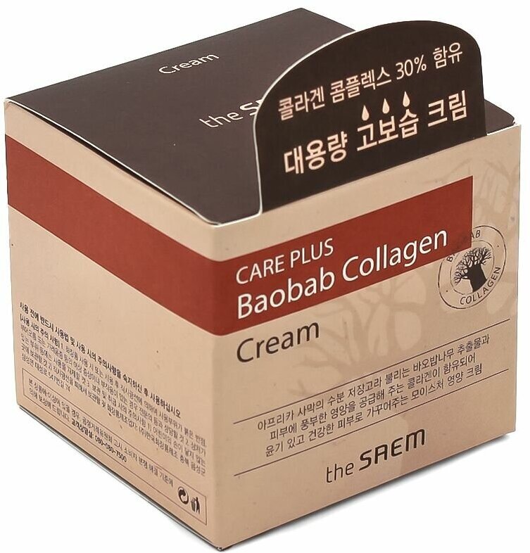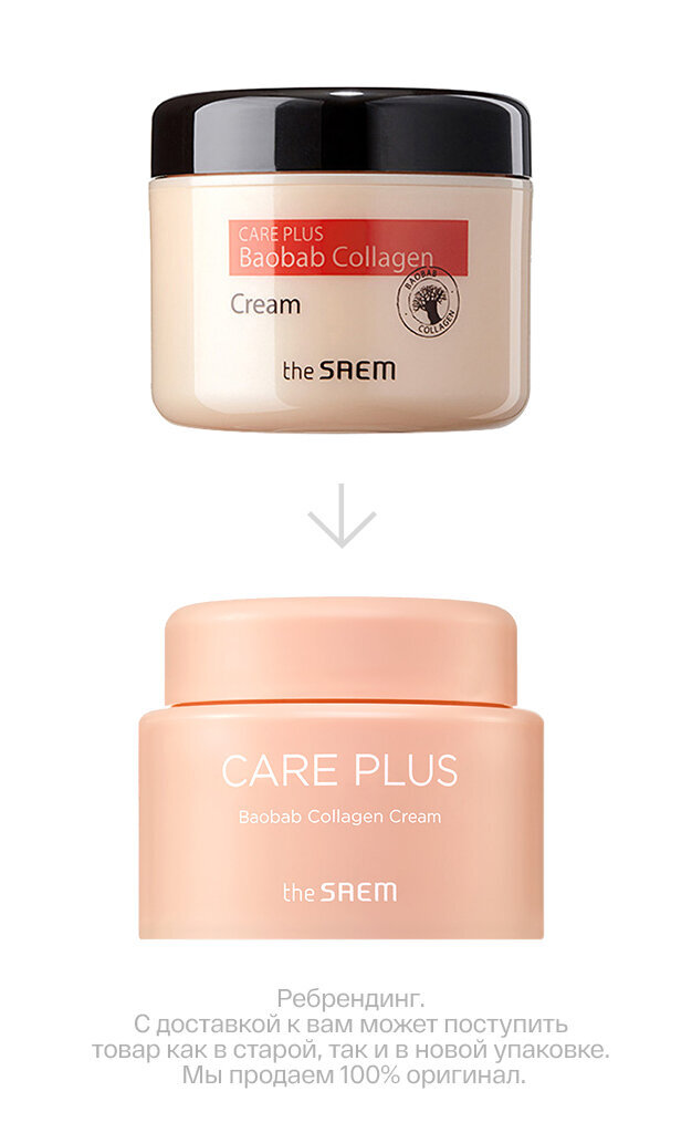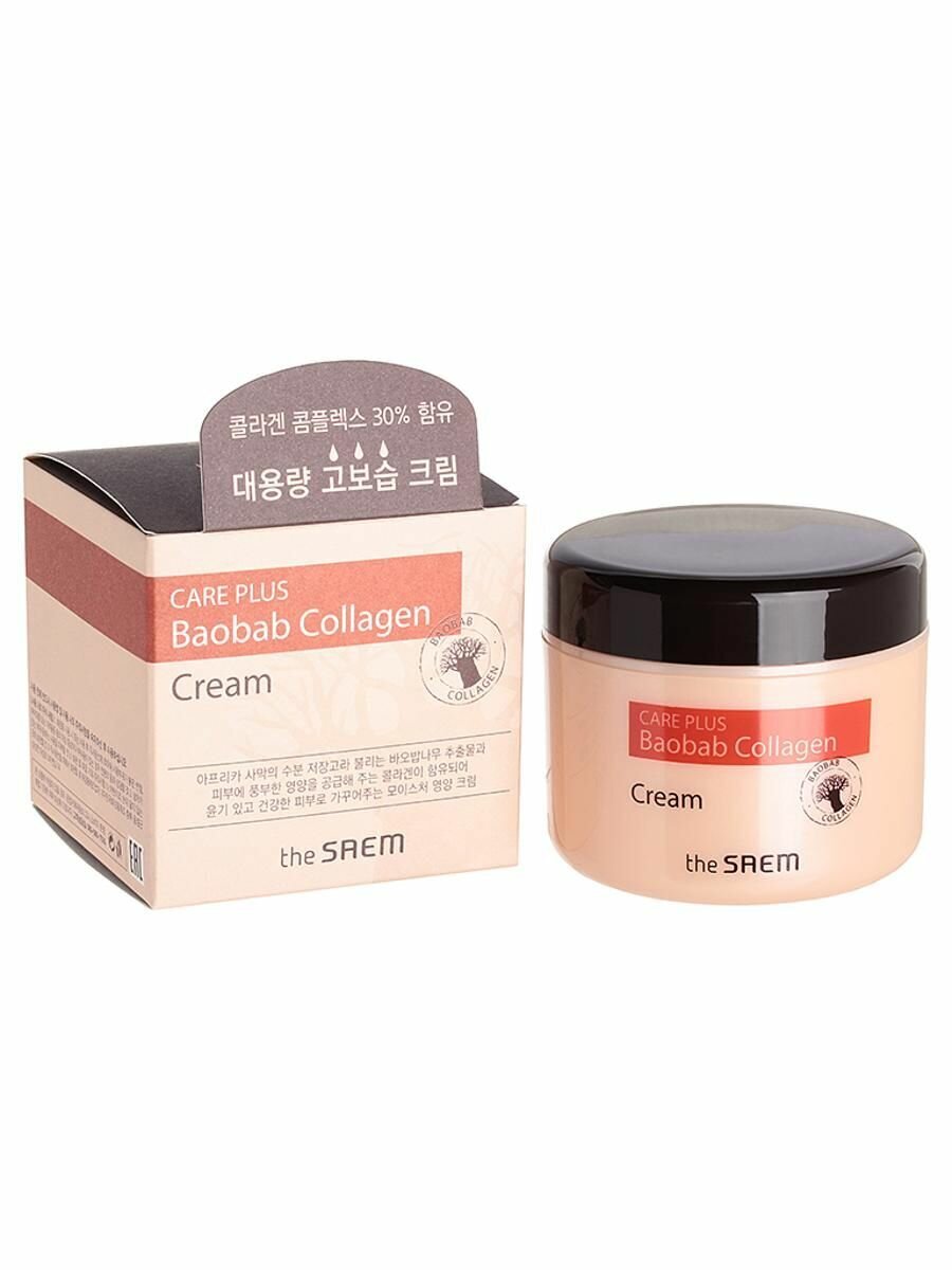 Коллагеновый крем для лица с экстрактом баобаба The Saem Care Plus Baobab Collagen Cream обладает интенсивным увлажняющим действием. Он эффективно борется с основными проблемами сухой и обезвоженной кожи: шелушениями, чувством стянутости, мелкими морщинками, тусклым цветом лица. Кроме того, при регулярном применении крем выравняет тон, в результате кожа приобретет здоровое сияние.