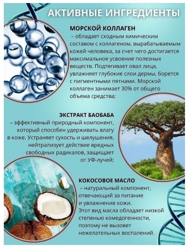 Экстракт баобаба. Как и коллаген, баобаб является мощным увлажняющим компонентом. Он обеспечивает активизацию процессов увлажнения и при этом не позволяет влаге испаряться из глубоких слоев эпидермиса. Кожа перестает быть стянутой, уходит сухость и обезвоженность, разглаживаются небольшие морщинки. Также экстракт баобаба снижает вредное воздействие свободных радикалов, агрессивных факторов окружающей среды, УФ-излучения