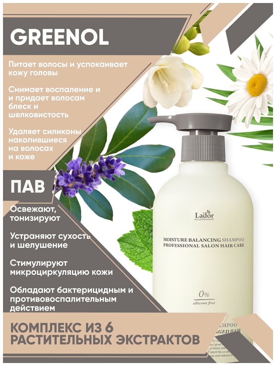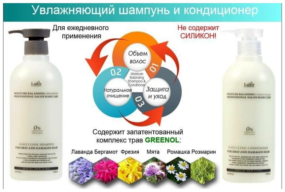 Шампунь содержит натуральный запатентованный компонент "Greenol", состоящий из 6-ти органических экстрактов: экстракт лаванды, экстракт бергамота, экстракт фрезии, экстракт мяты, экстракт ромашки, экстракт розмарина. Не содержит силикон