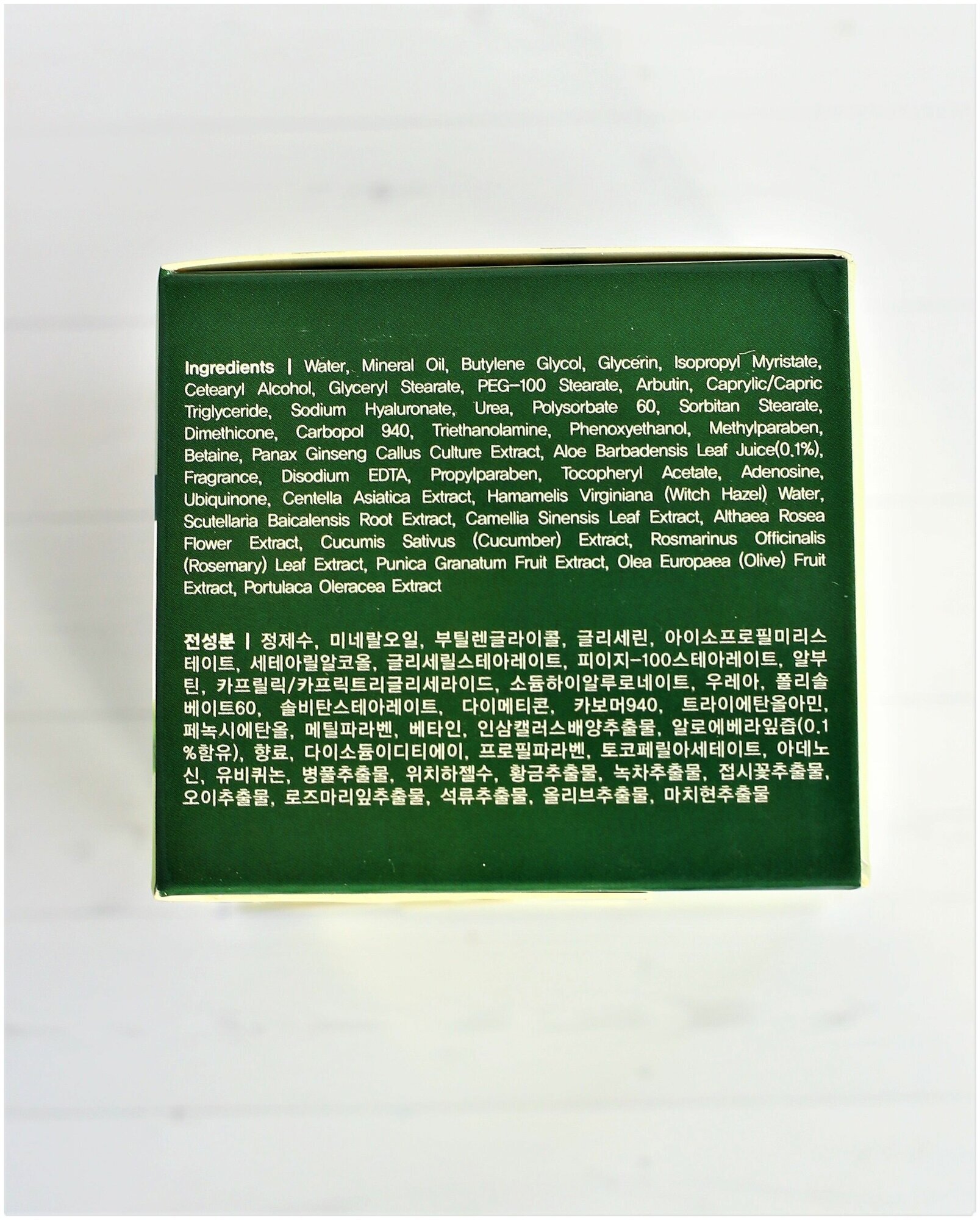 Вода, минеральное масло, глицерин, пропиленгликоль, полисорбат 60, глицерилстеарат SE, стеариновая кислота, цетеариловый спирт, глицерилстеарат/ПЭГ-100 стеарат, глицерилстеарат, триэтаноламин, сорбитансесквиолеат, диметикон, карбомер, феноксиэтанол, метилпарабен, аллантоин, Полиакрилат натрия, ксантановая камедь, ароматизатор, линалоол, гексилциннамал, лимонен, альфа-изометилионон, фильтрат секрета улитки (100 частей на миллион), экстракт листьев камелии китайской, экстракт листьев алоэ барбаденсис